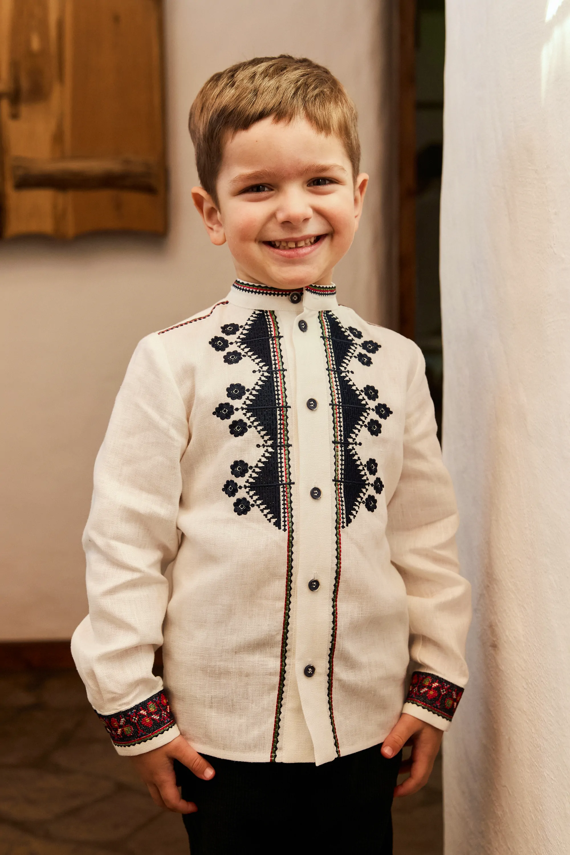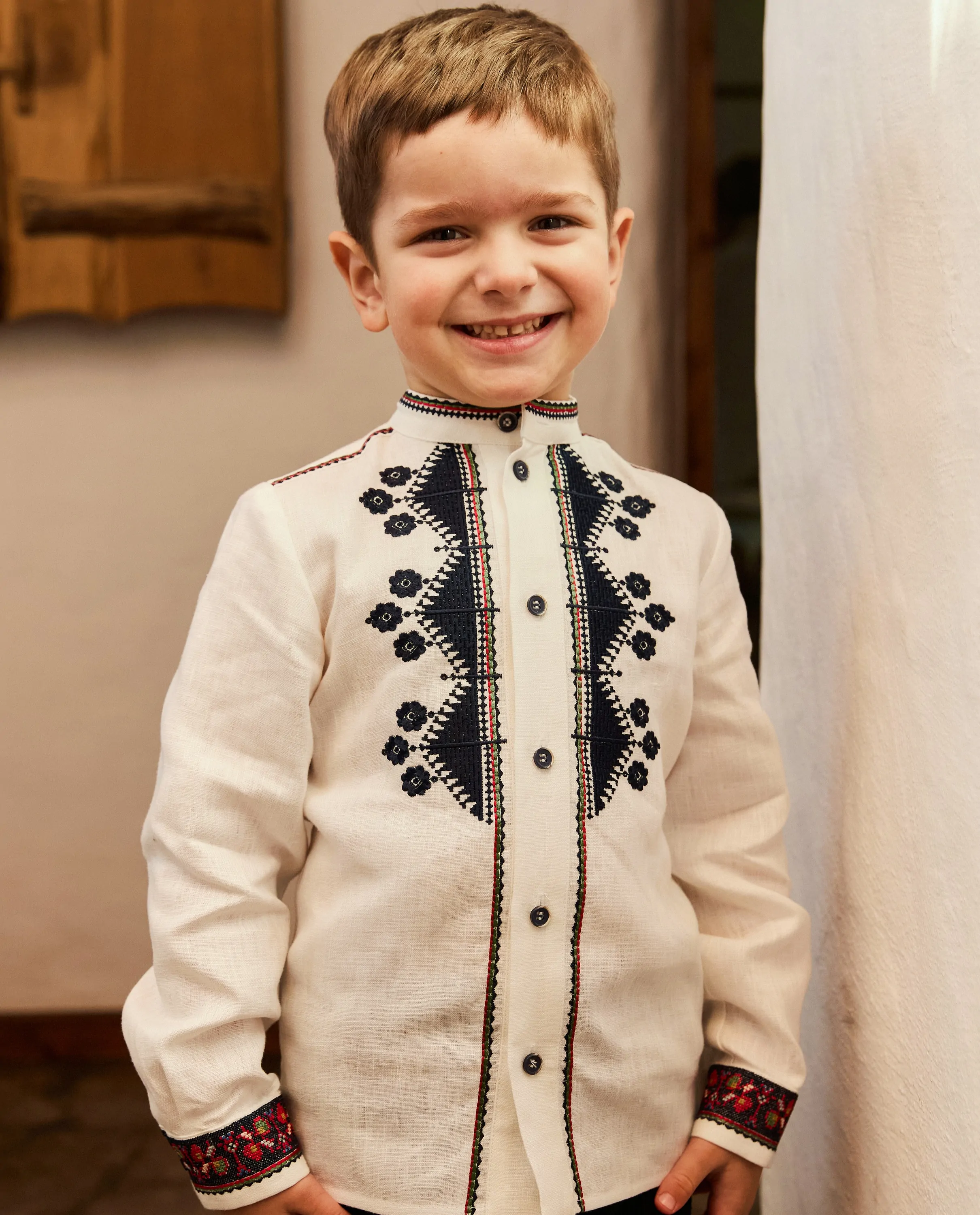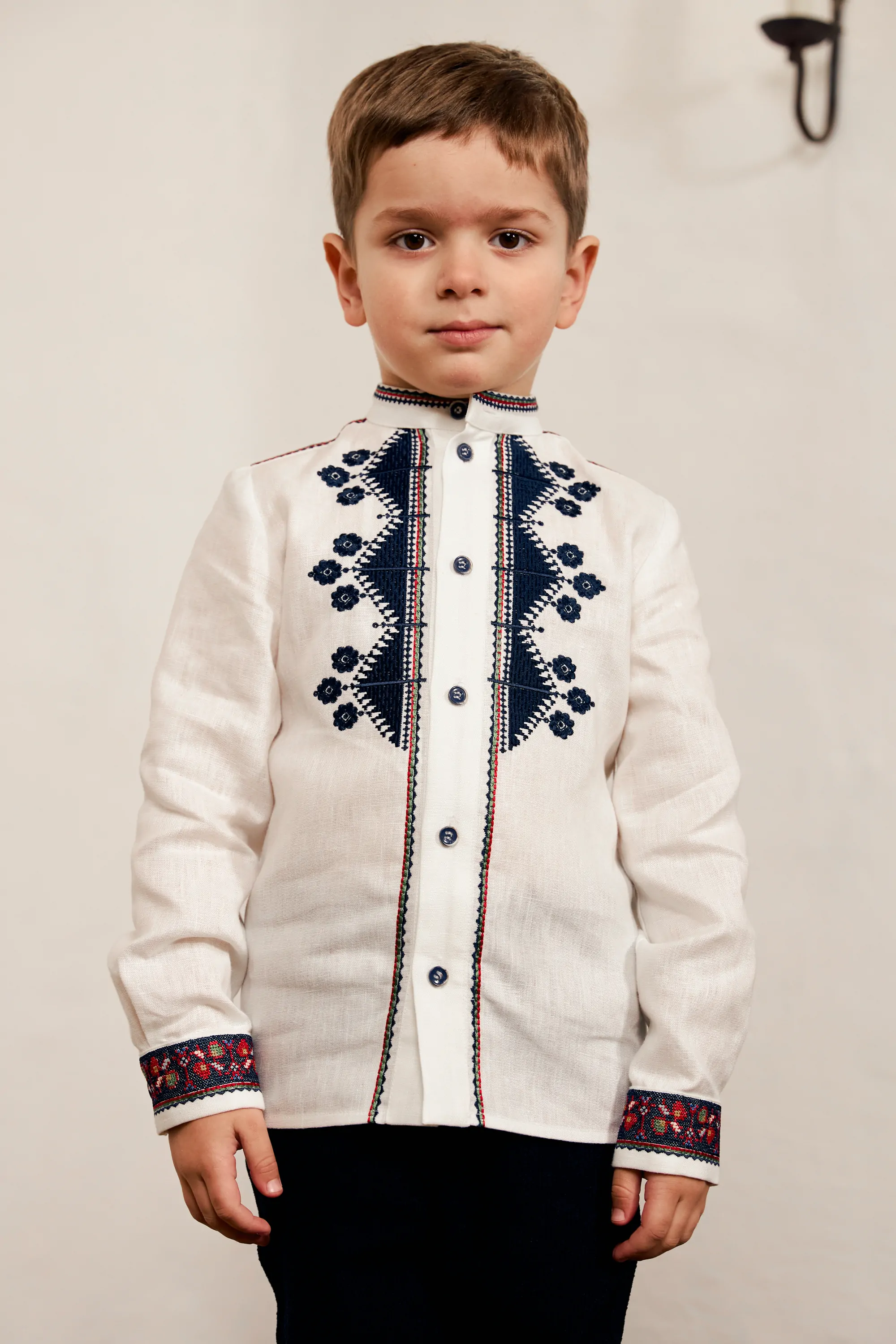 Дитяча сорочка на ґудзики із синім різдвяним орнаментом. Біля горловини розміщені квіти та елементи, схожі на зорі.