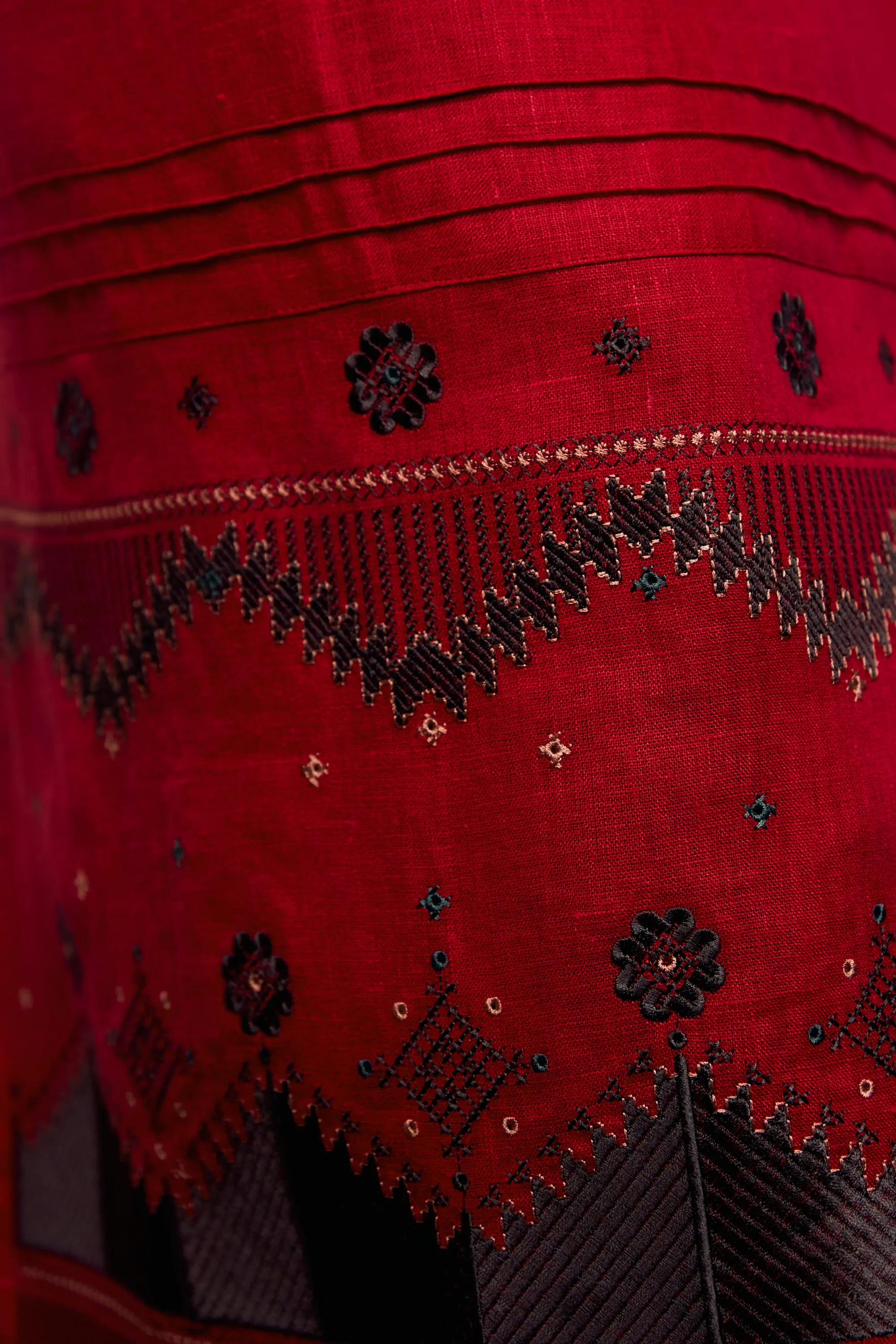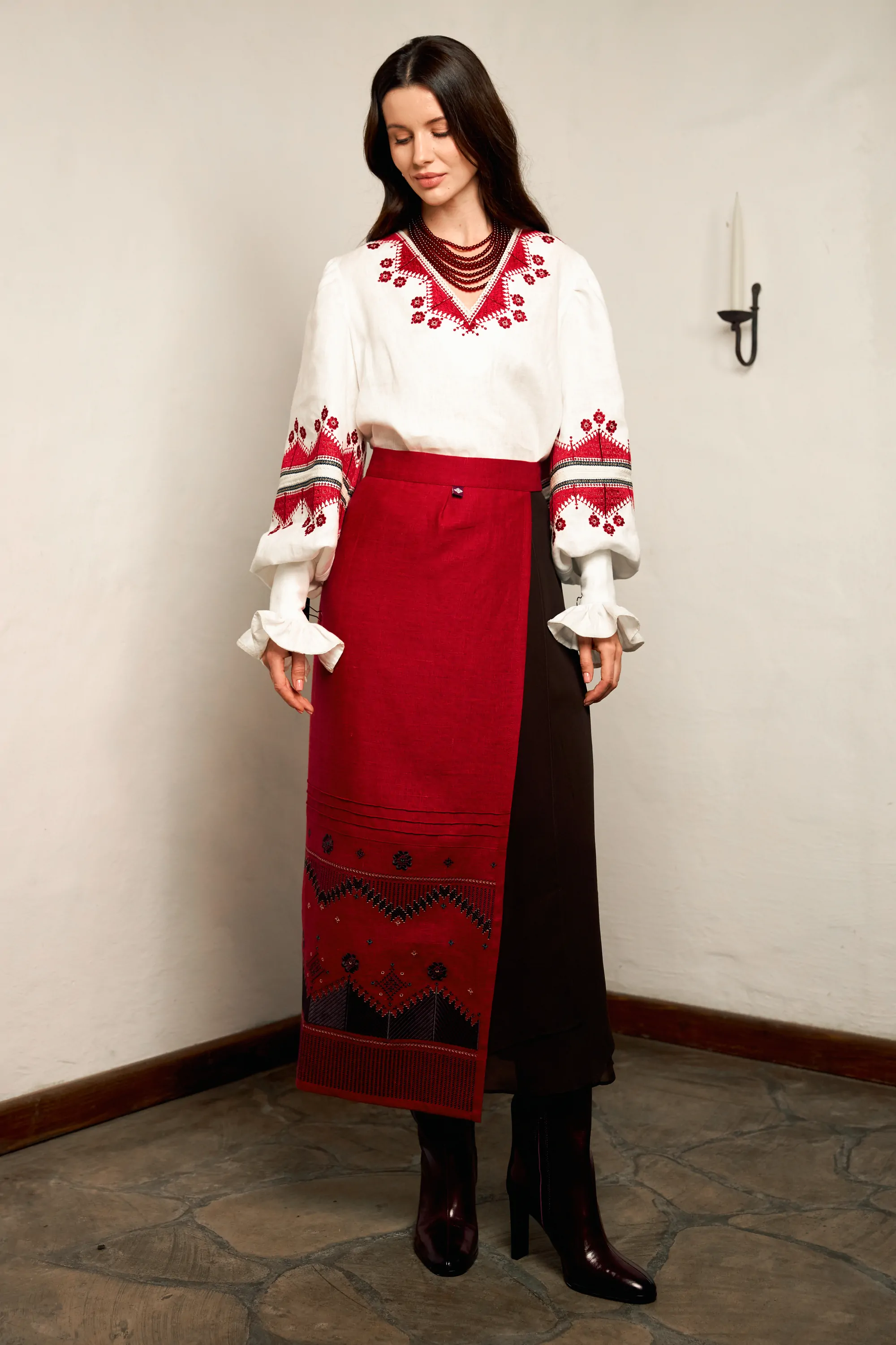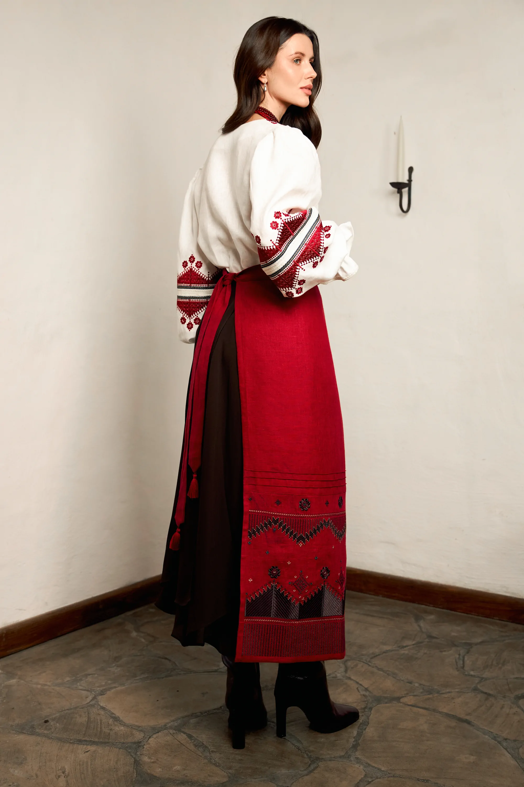 Фартушок виконаний у малиновому кольорі та оздоблений різдвяним орнаментом.