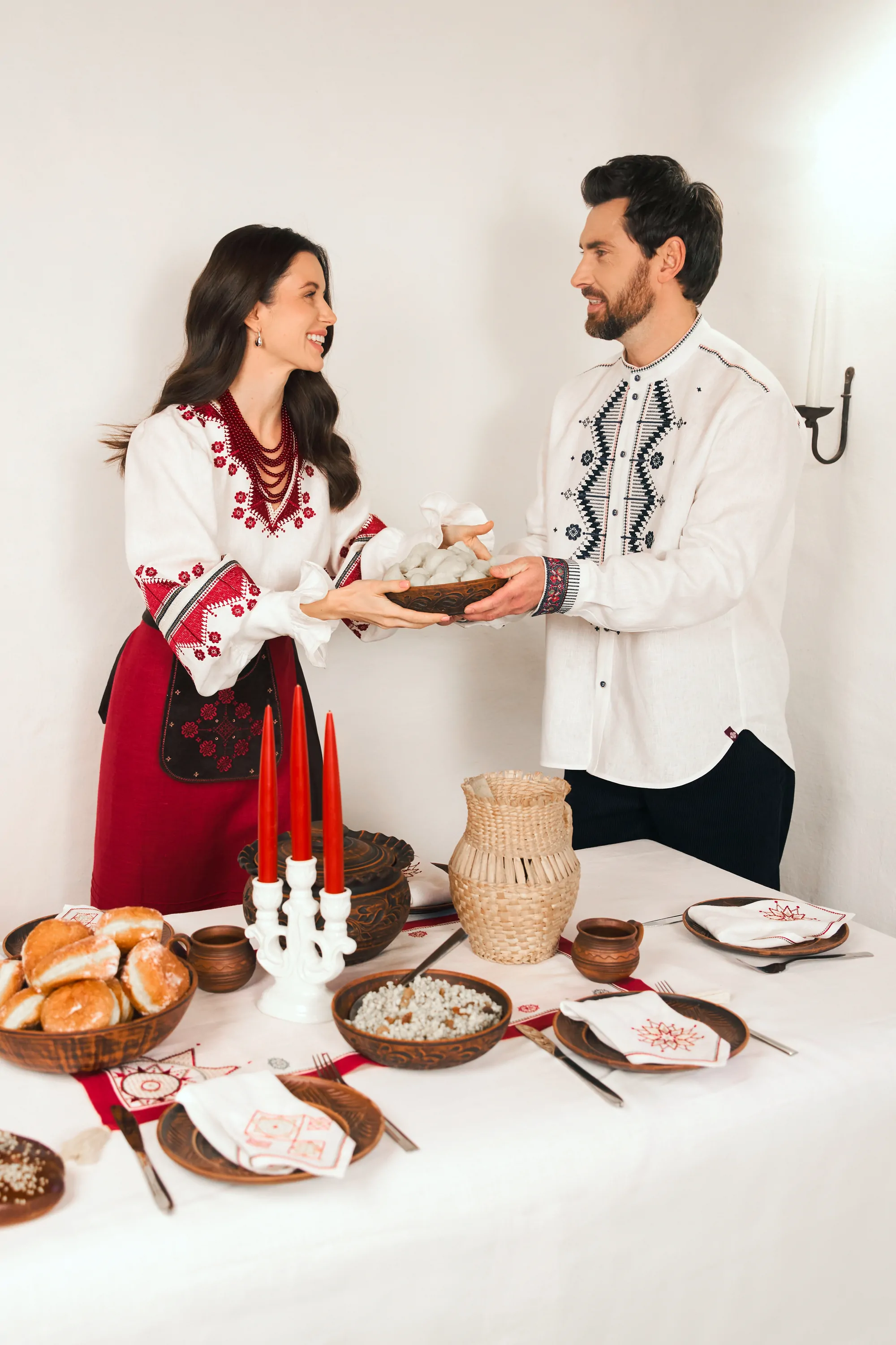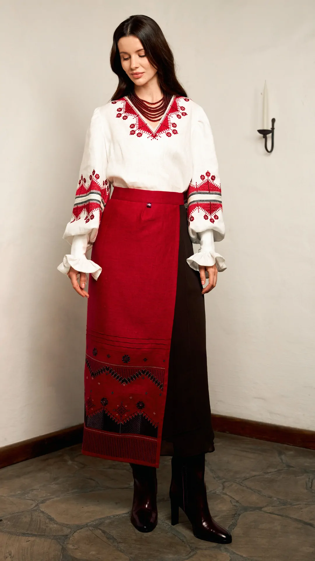 Фартушок виконаний у малиновому кольорі та оздоблений різдвяним орнаментом.