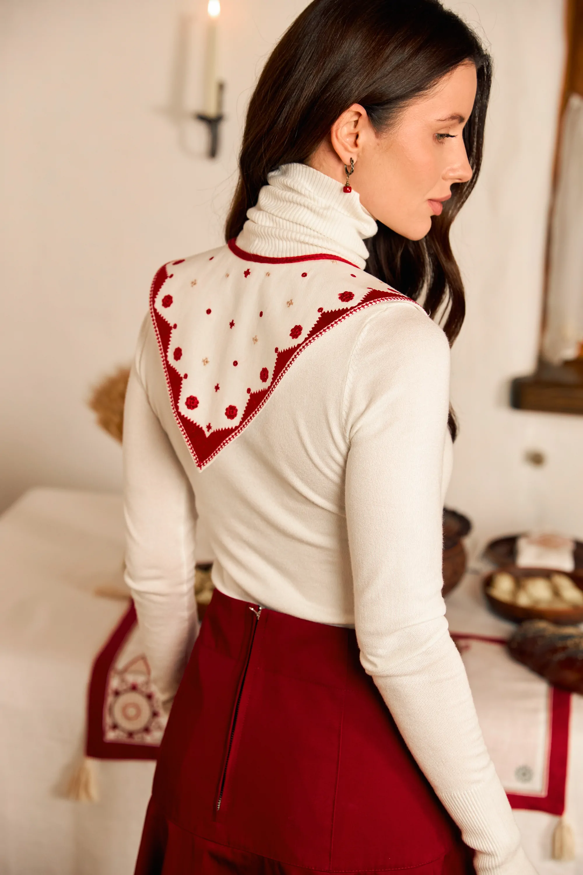 Аксесуар молочного кольору, прикрашений червоними зірками. Комірець зав’язується спереду китицями та стане чудовим акцентом для зимових образів та особливих моментів.