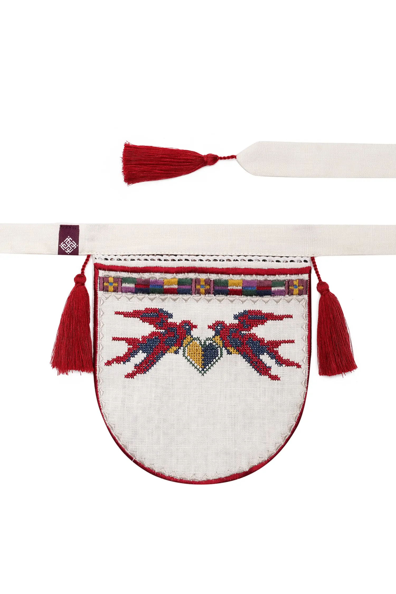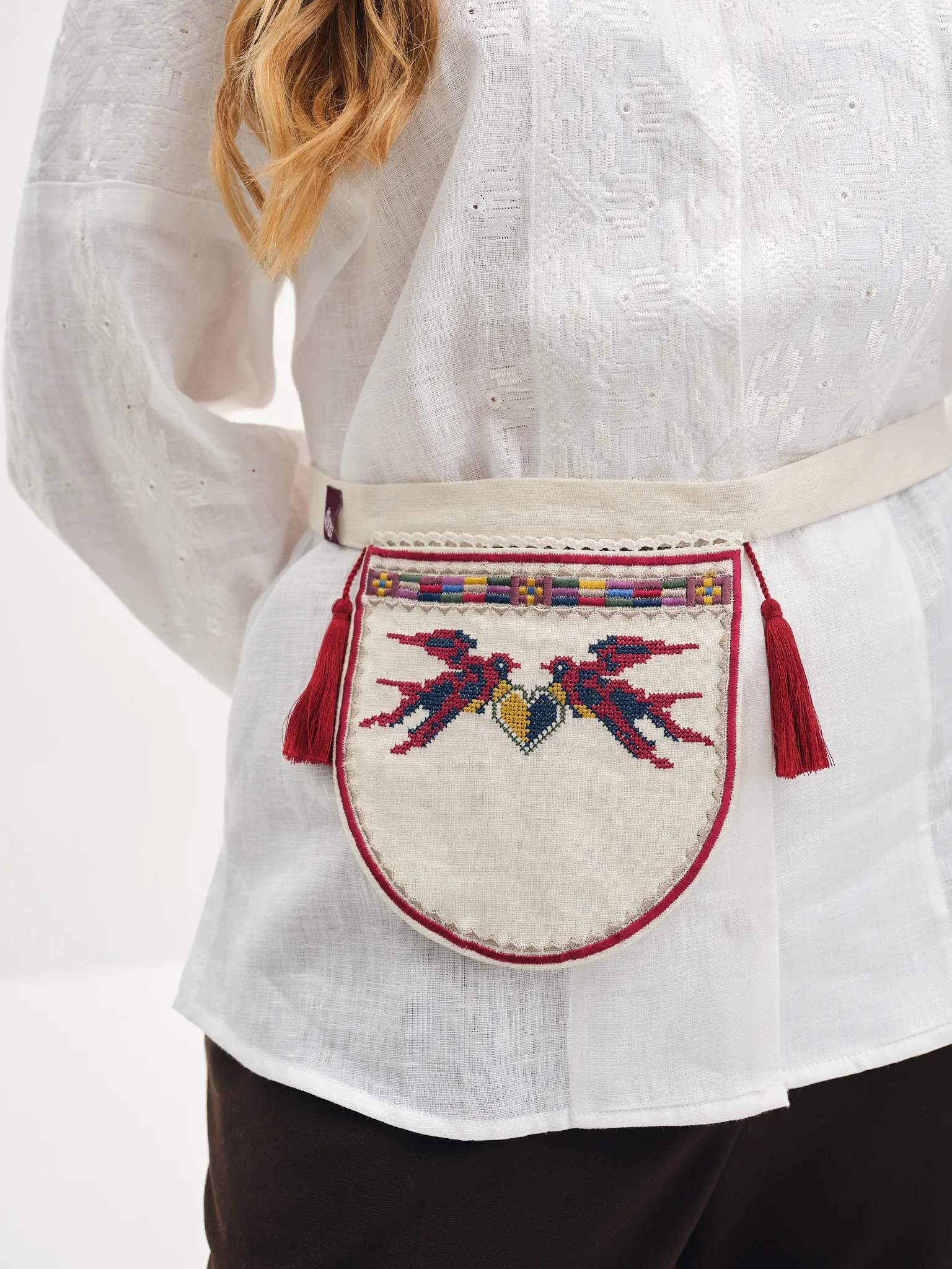На кишеньці відтворений орнамент з етнографічного району Верховина – дві пташки, що тримають серце з синьо-жовтим стягом. Походження візерунку з гуцульського району, село Верховина.