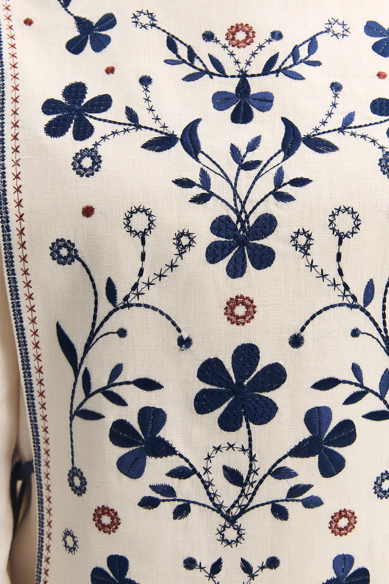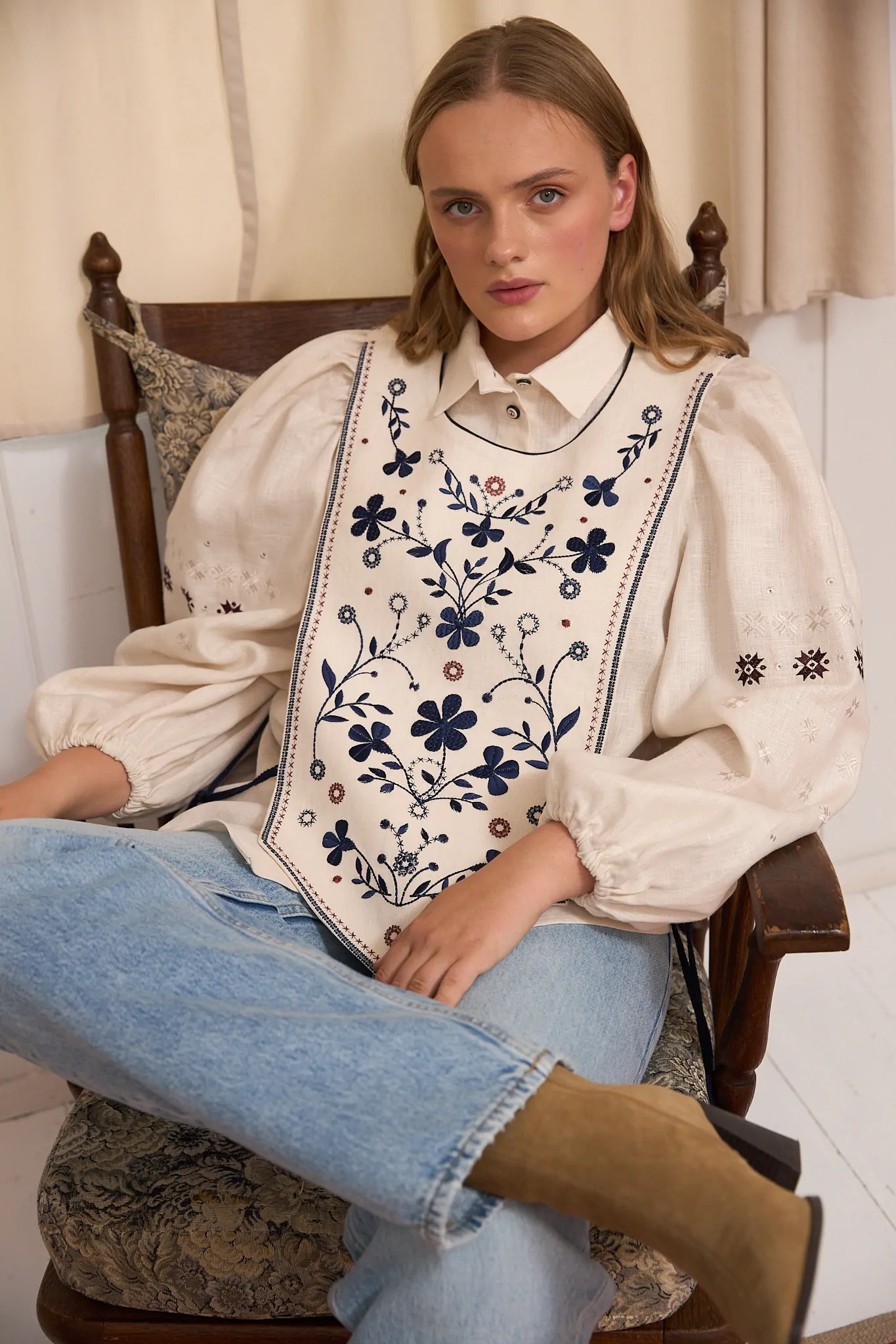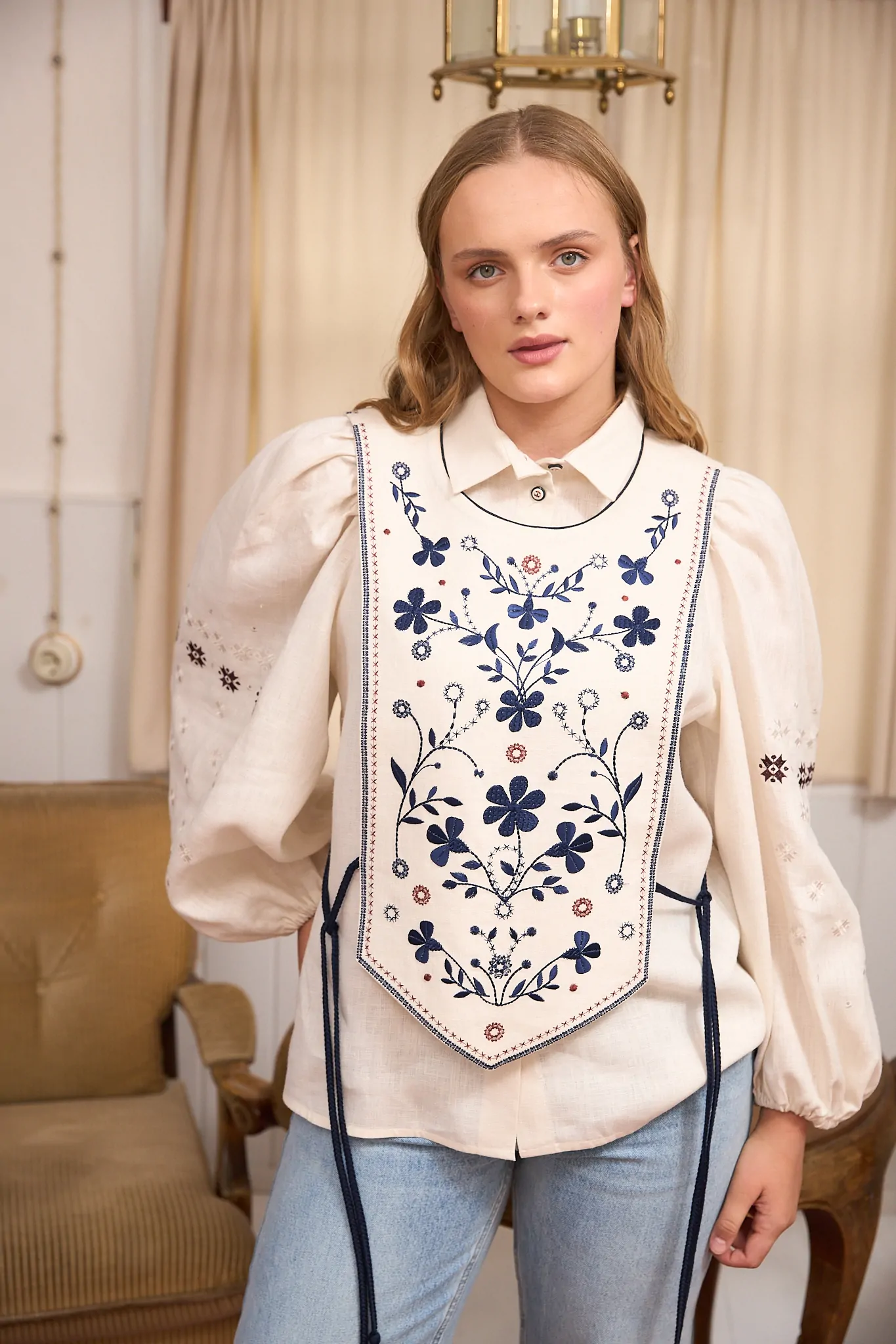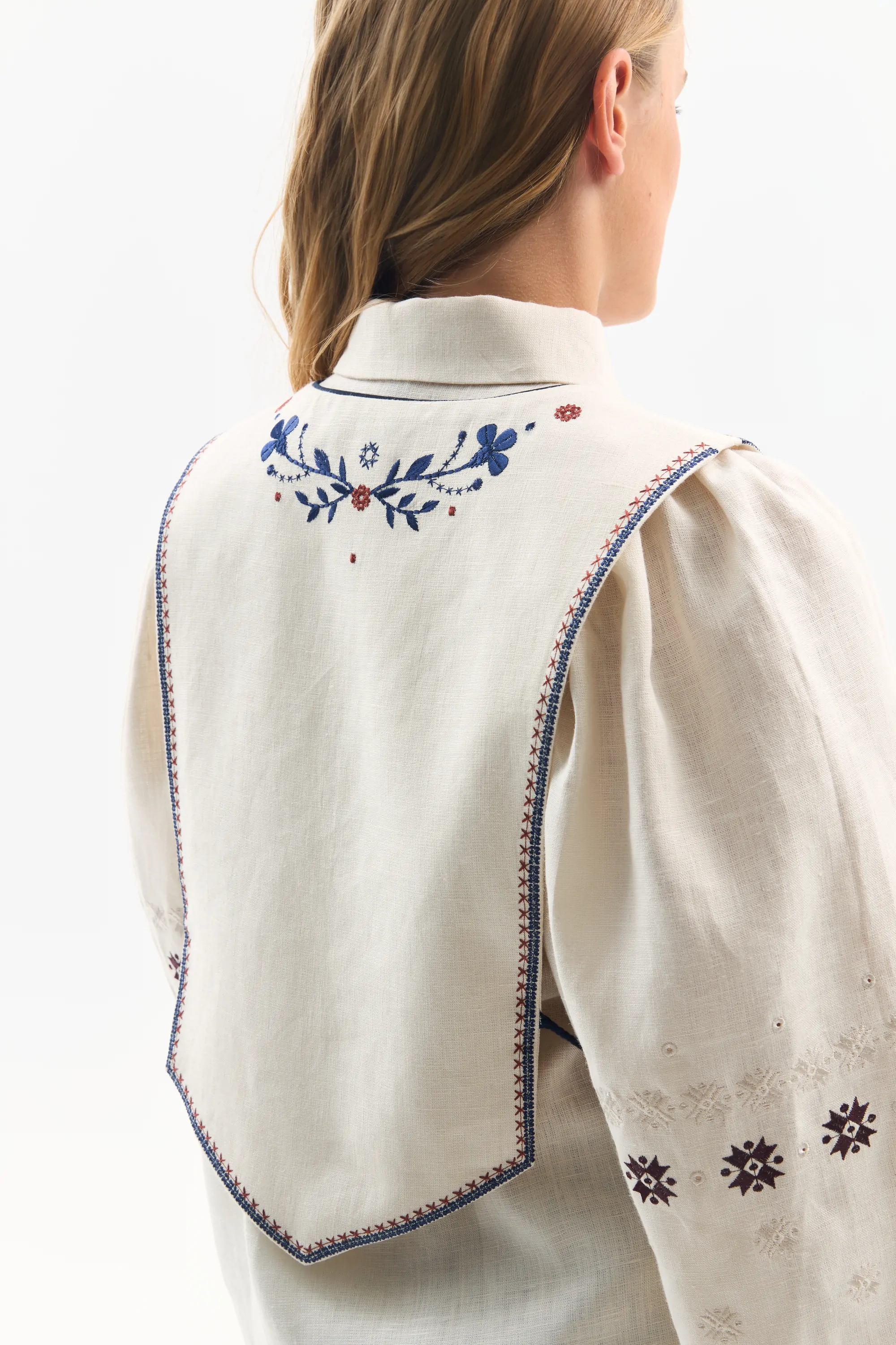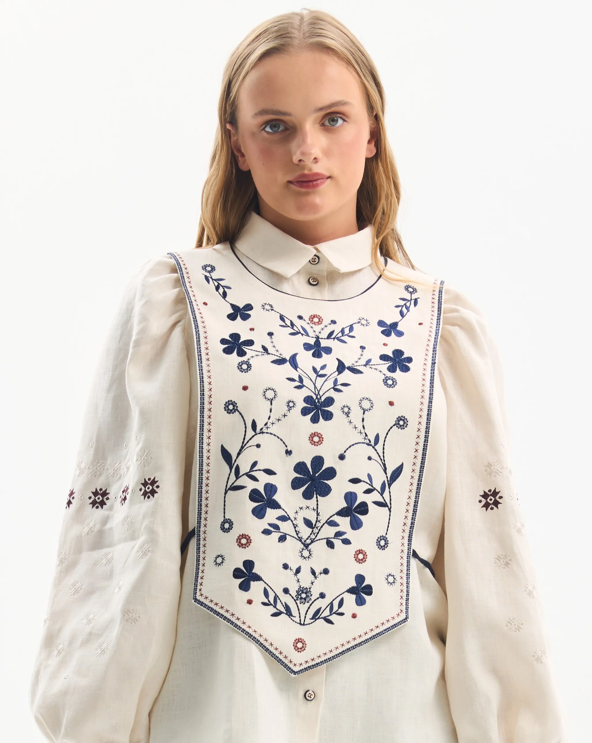 Вишита маніжка молочного кольору з квітковим орнаментом. Основним джерелом натхнення для дизайну став цвіт льону, який вважається символом ніжності та дівочої краси.