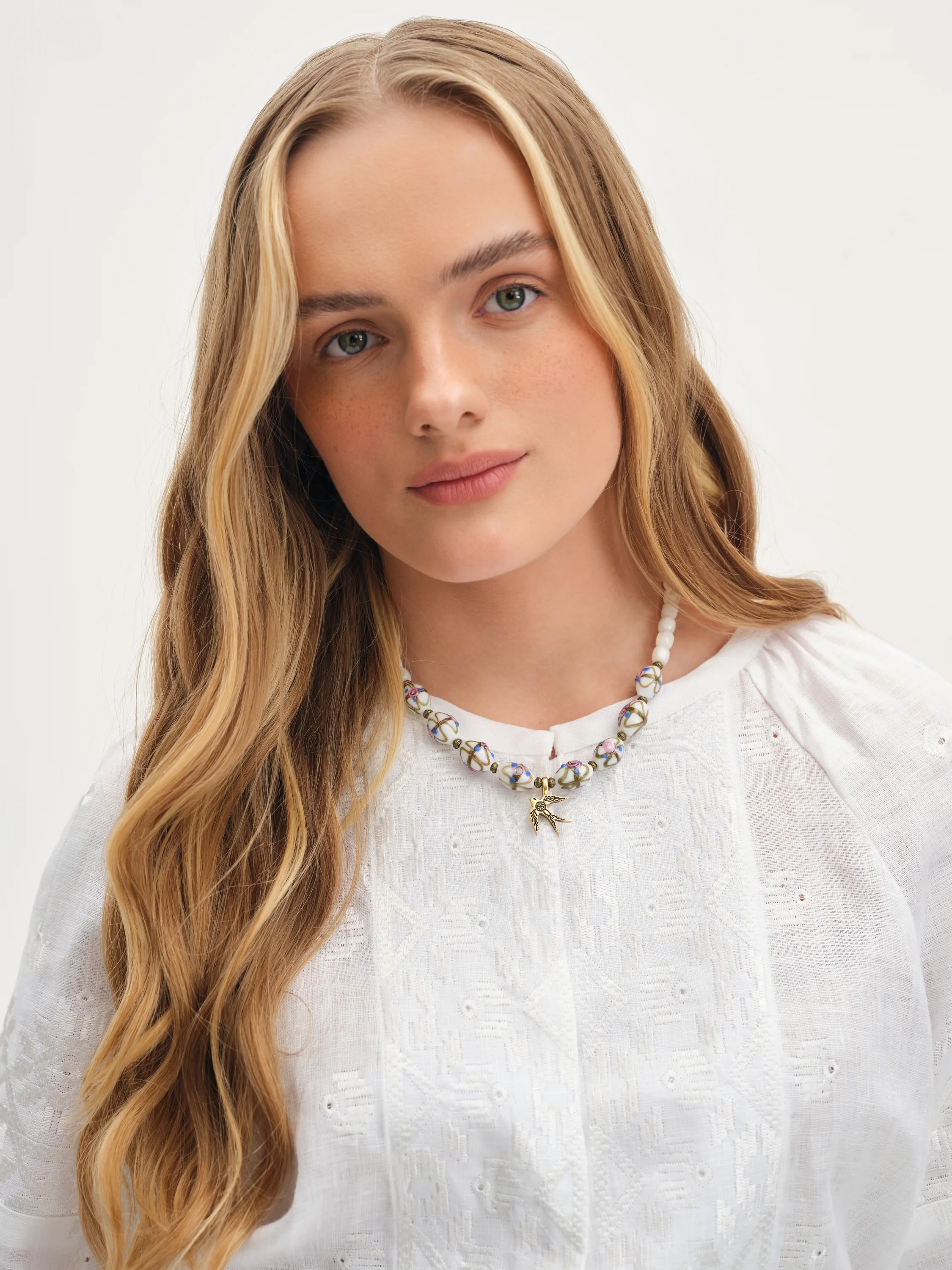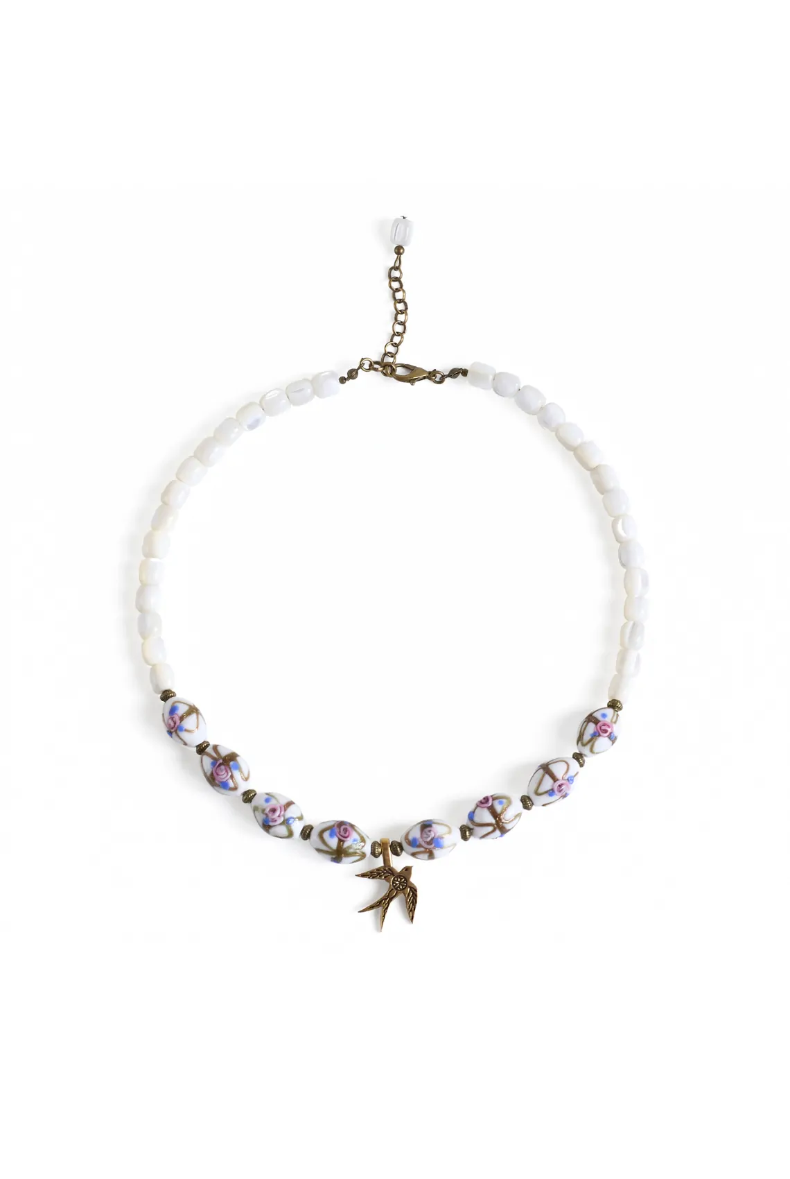 Намисто зі скляних намистин, які виконані під венеційські. Містить перламутрові камінці.