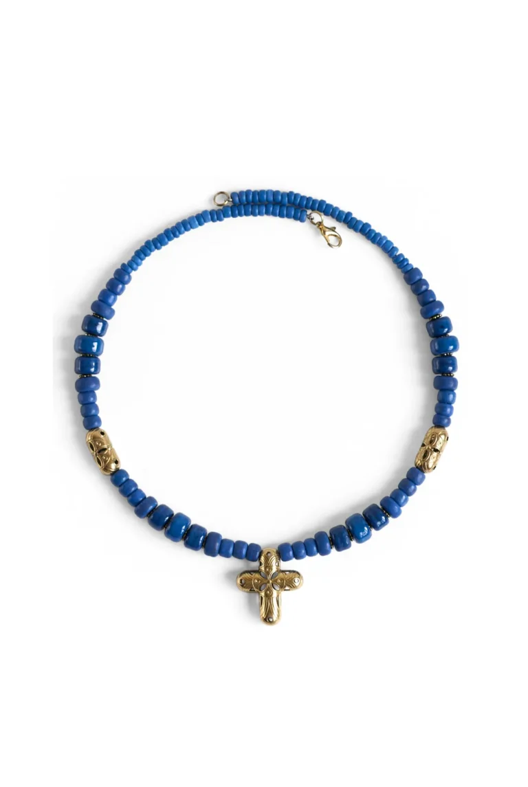 Намисто з намистин косівської кераміки насиченого синього кольору з латунним хрестом у центрі.