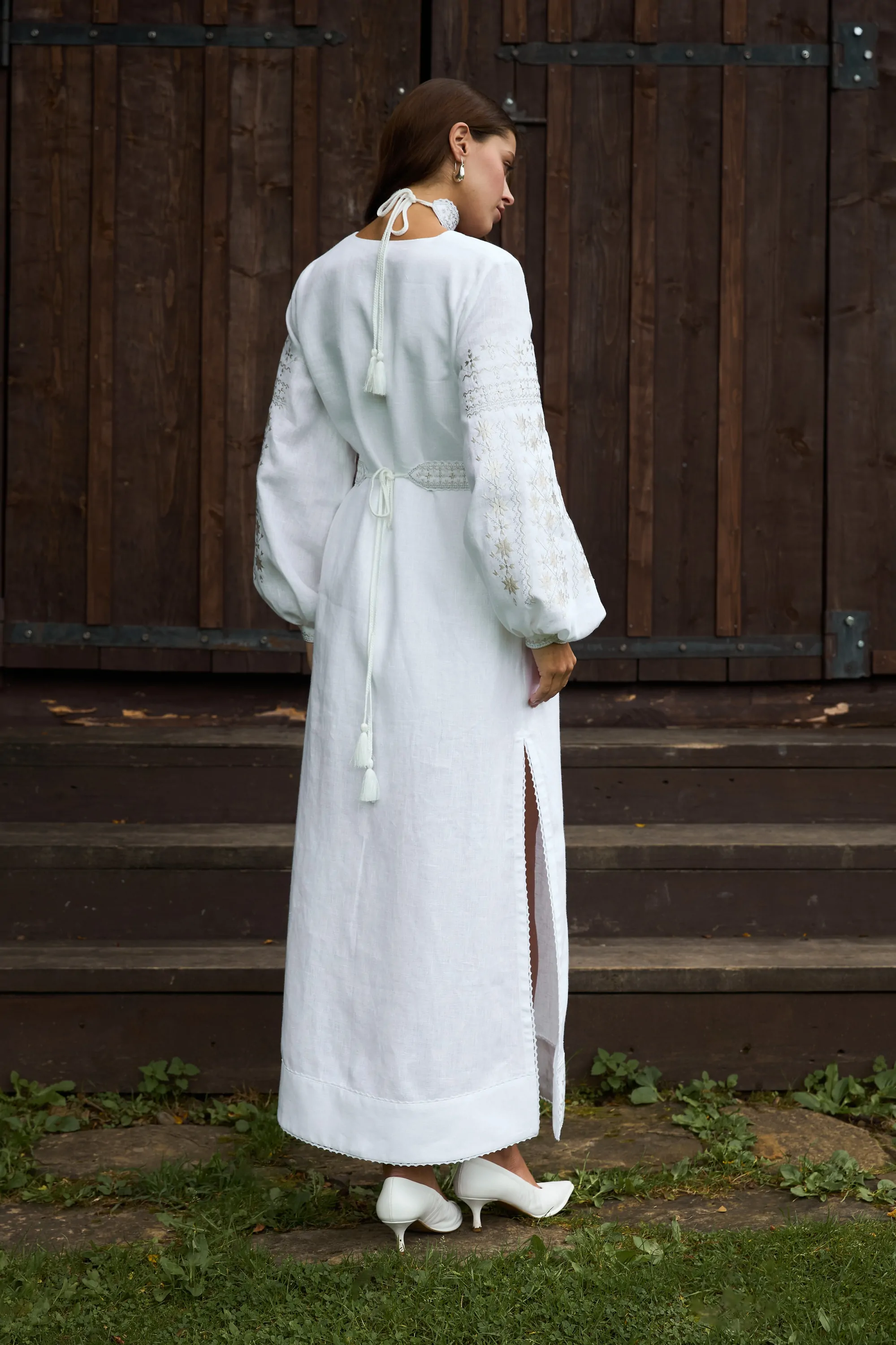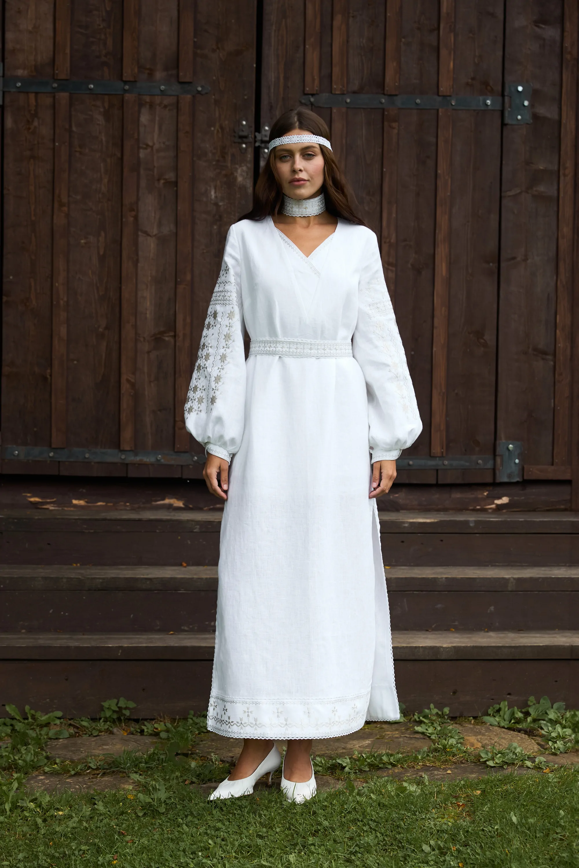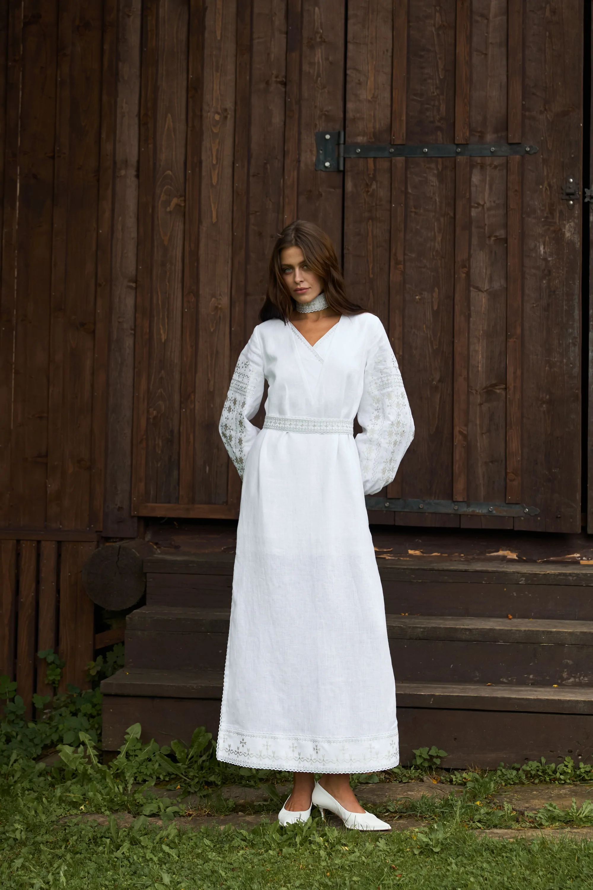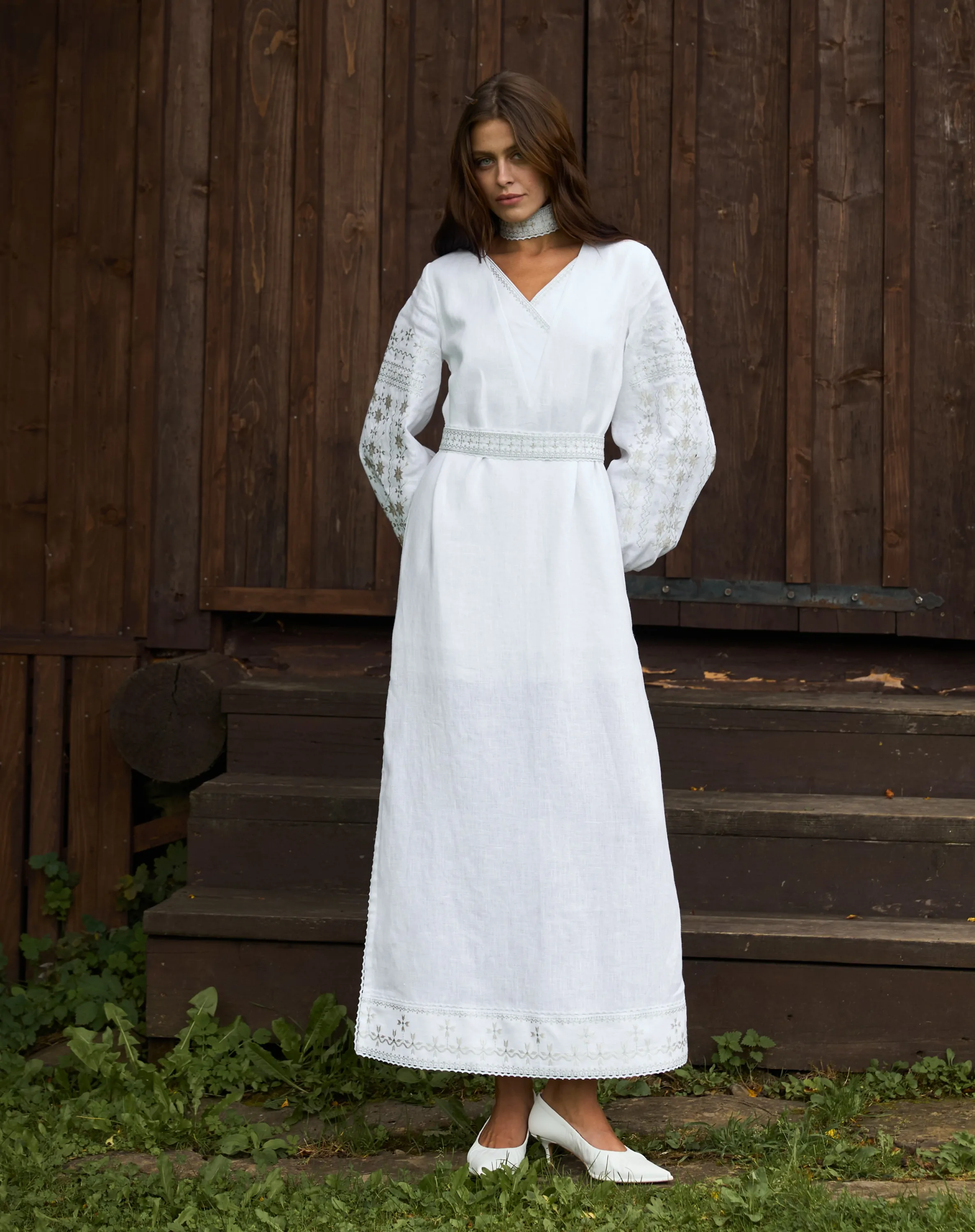 У комплекті з сукнею є вишитий пояс з китичками та вишитий чокер.