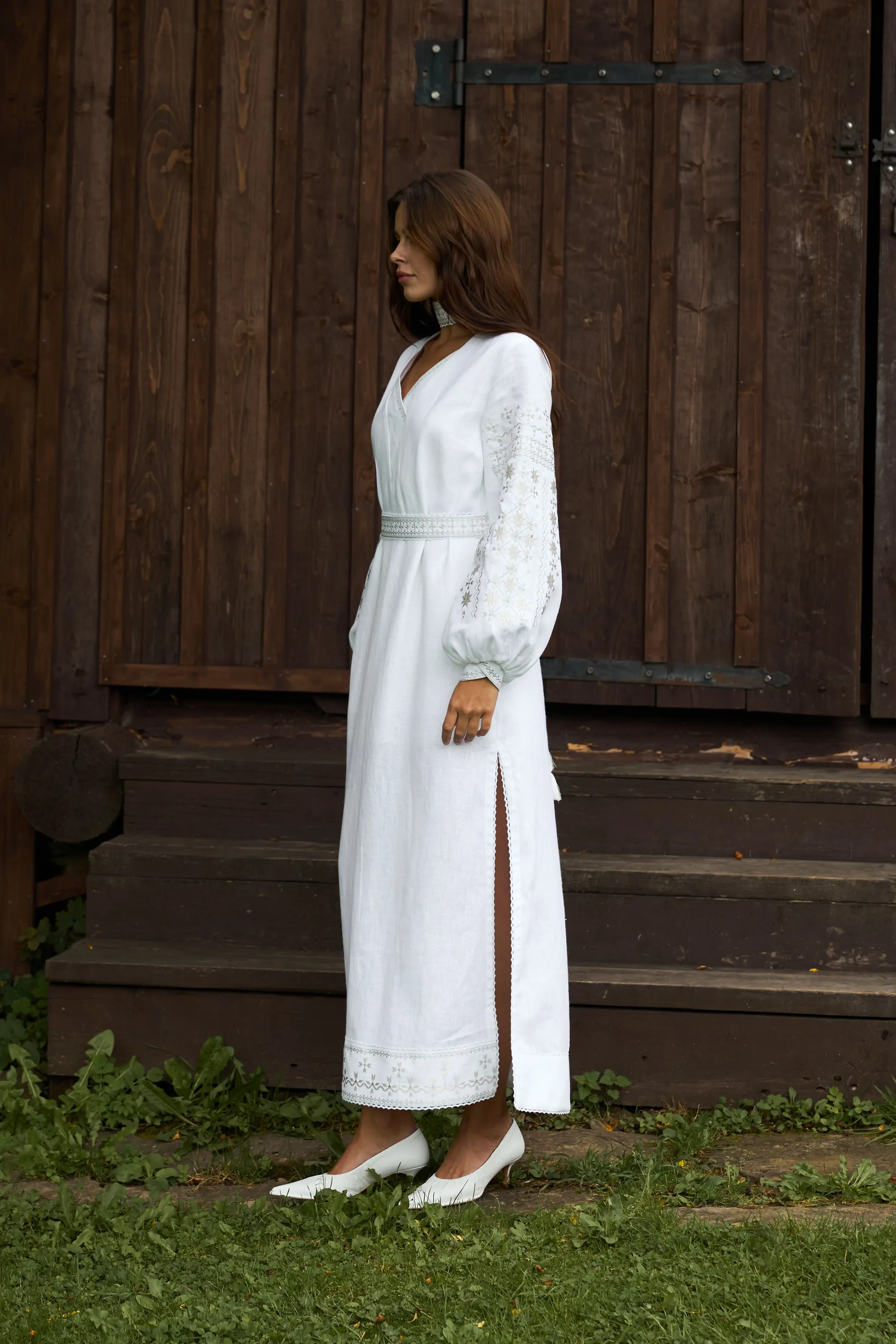 Вишита сукня з V-подібною горловиною. Манжети застібаються на ґудзики.