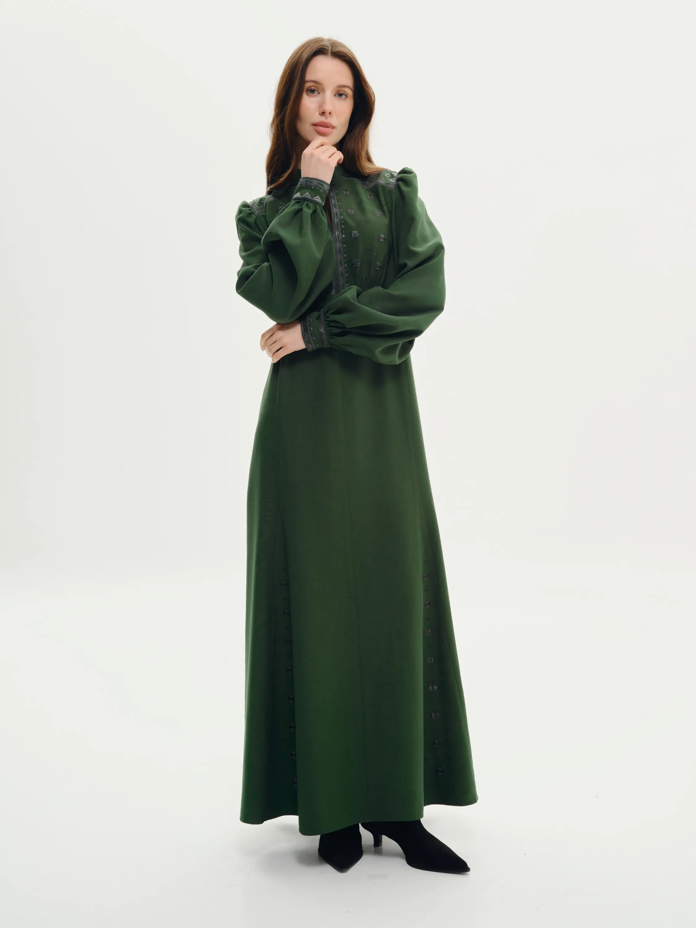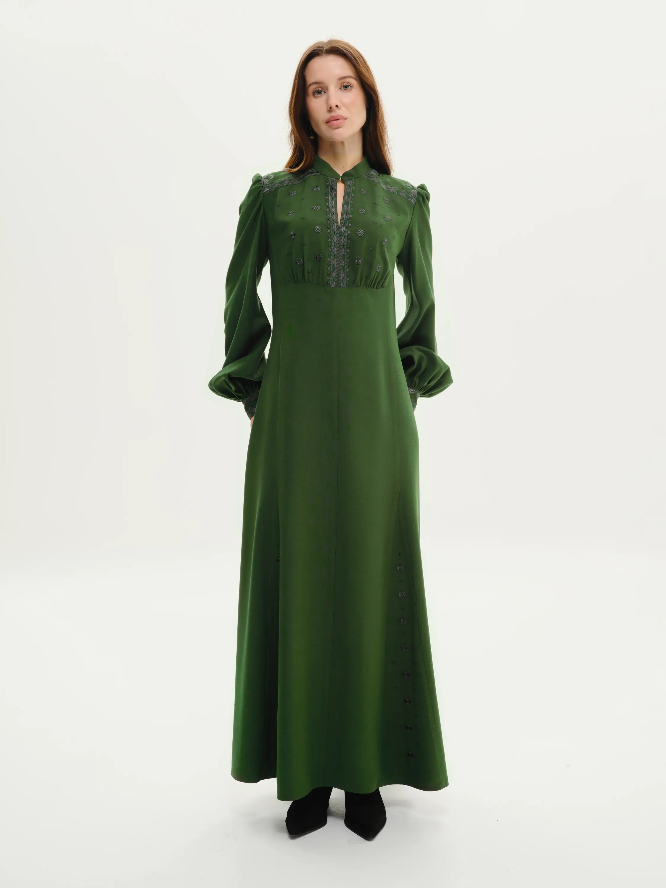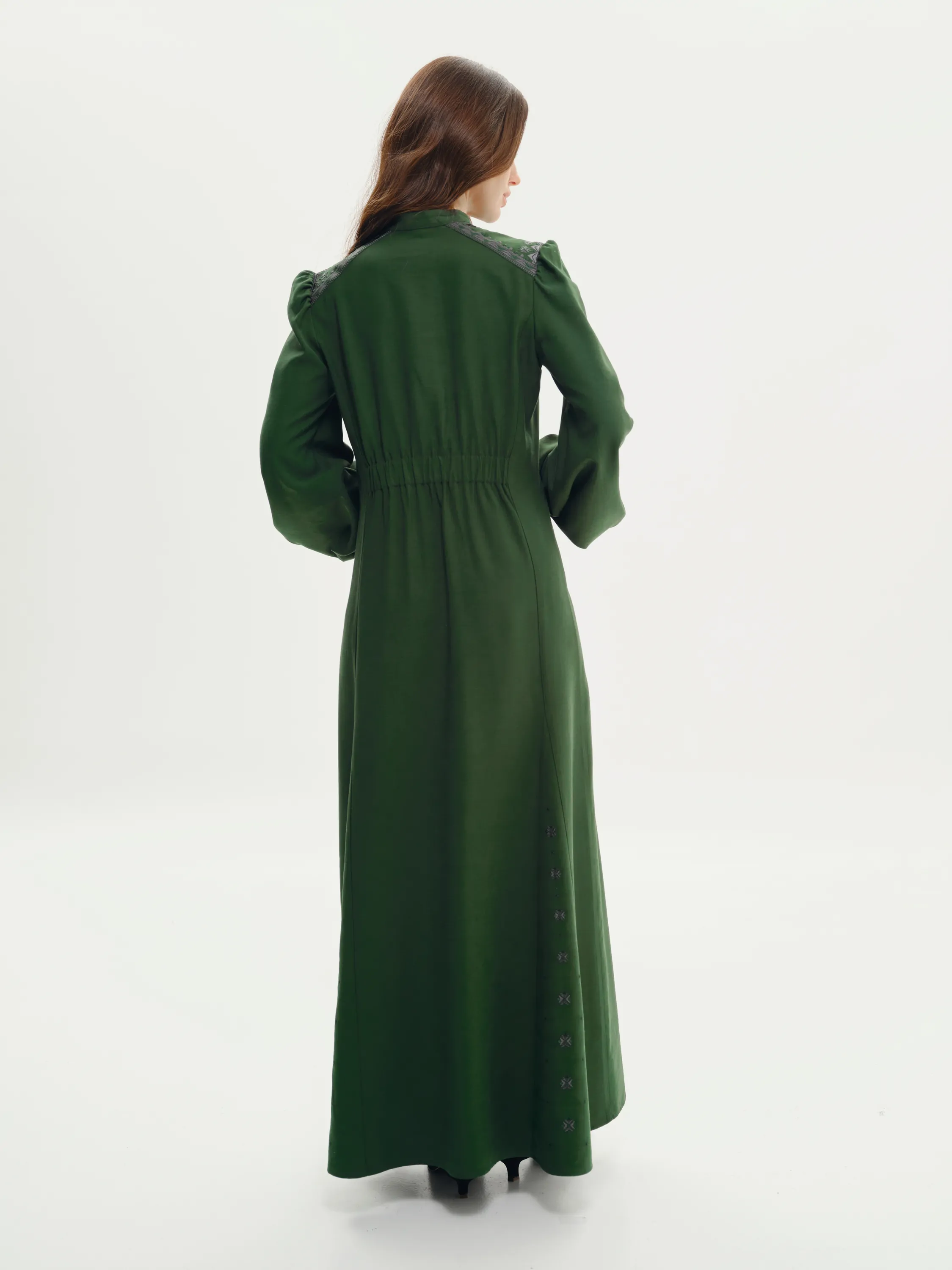 Орнамент на сукні є авторським, від дизайнерів SVARGA. Тканина смарагдового кольору, у відтінку хвої або глибокої зелені. Стиль сукні має легкий вінтажний ретро-фльор. Манжети на рукавах застібаються на ґудзики.