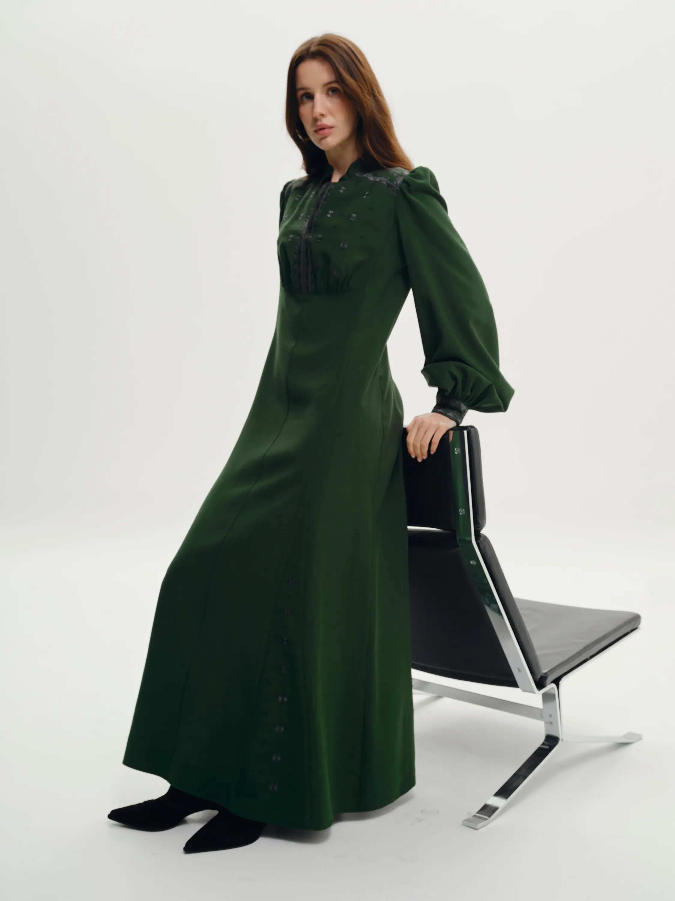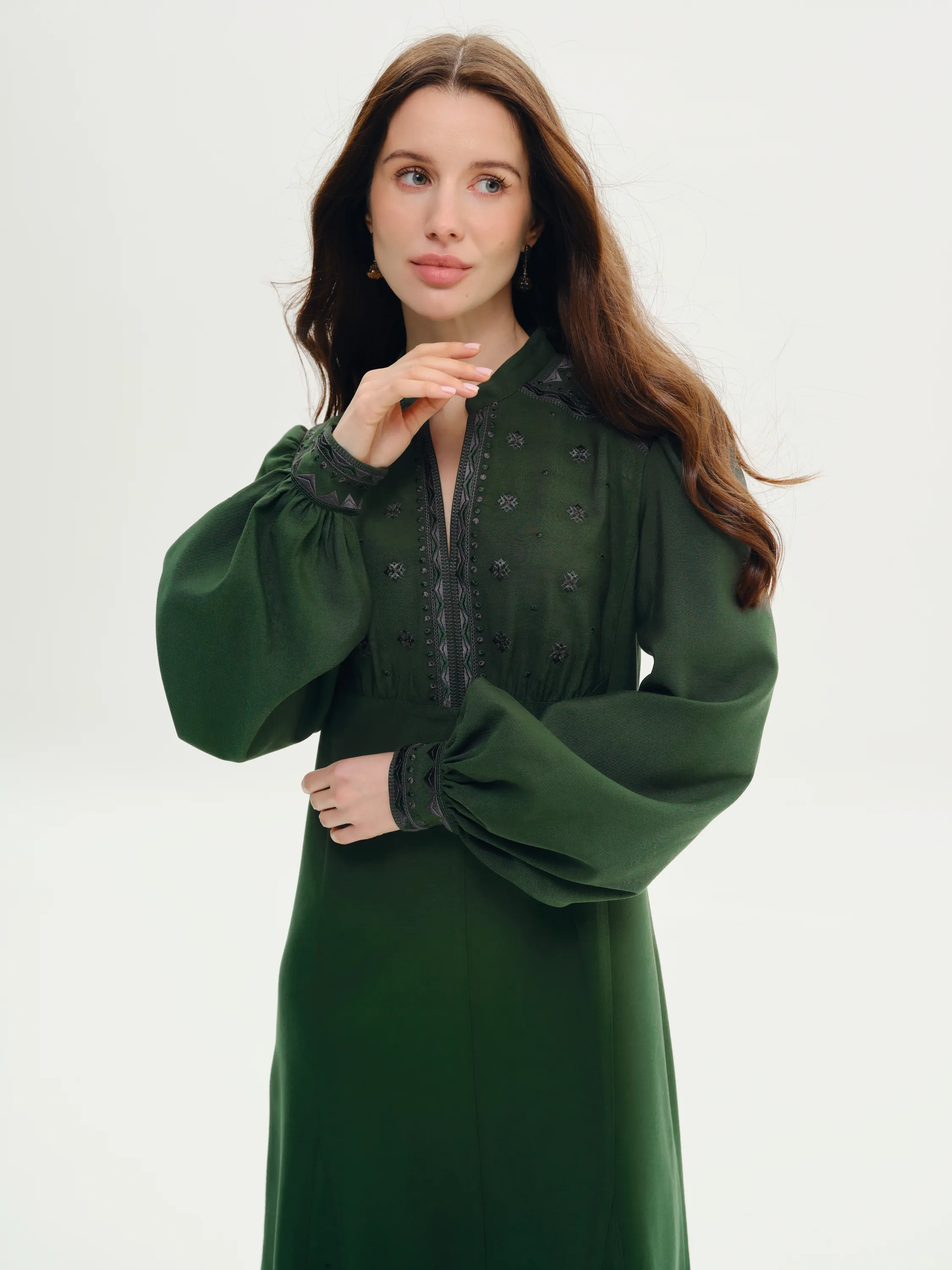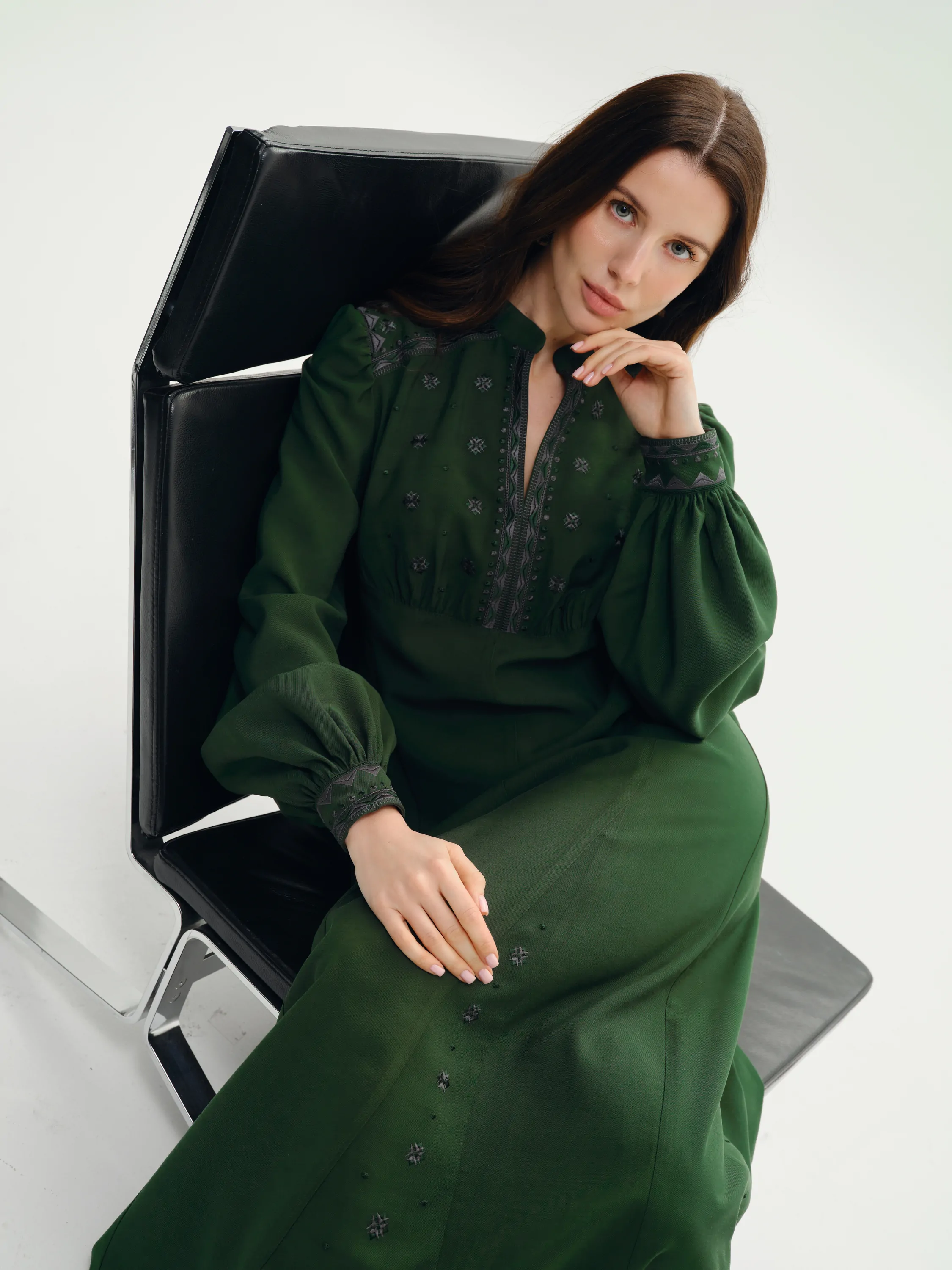 Орнамент на сукні є авторським, від дизайнерів SVARGA. Тканина смарагдового кольору, у відтінку хвої або глибокої зелені. Стиль сукні має легкий вінтажний ретро-фльор. Манжети на рукавах застібаються на ґудзики.