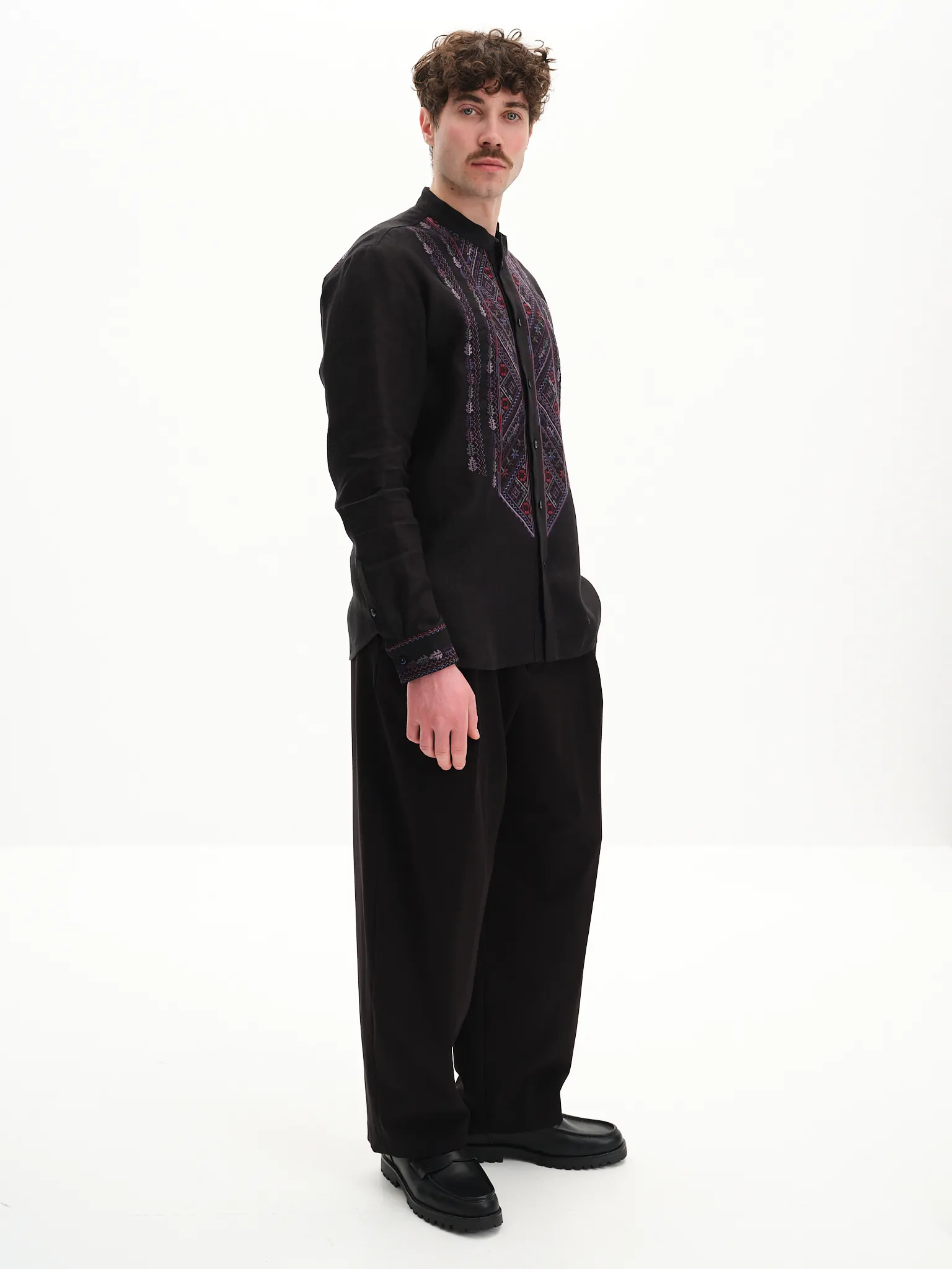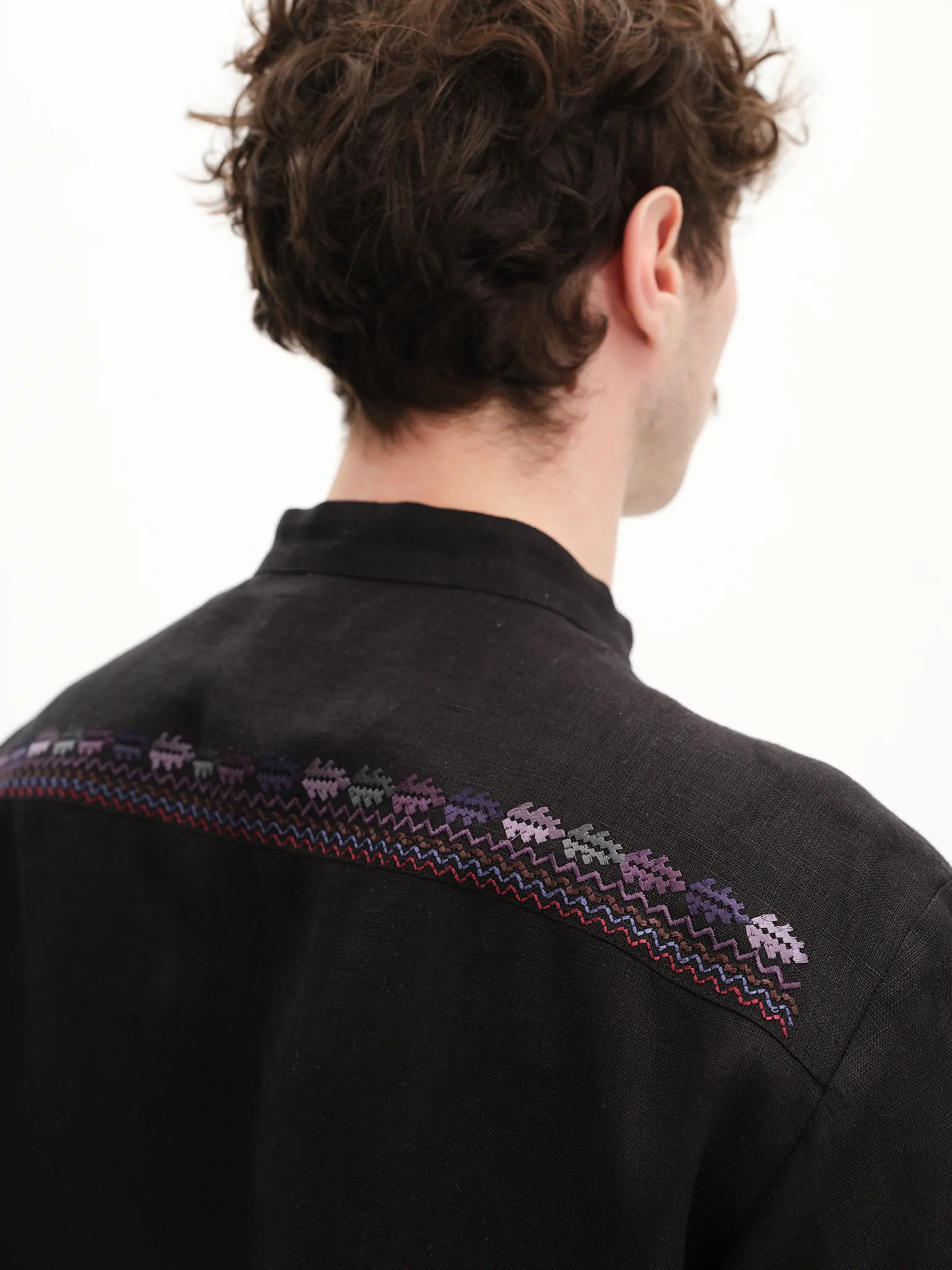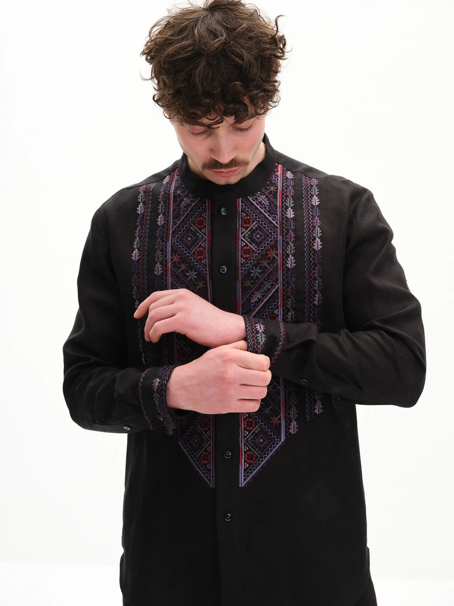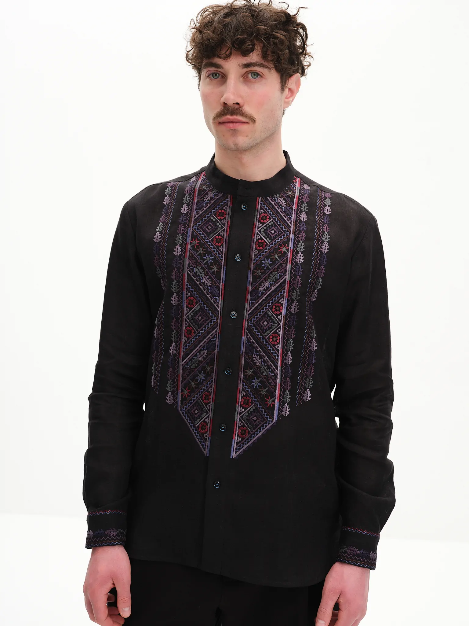 Вишиванка виконана зі 100% льону. Виріб застібається на ґудзики. В основі орнамента закладено мотиви авторських візерунків вишивальниці Ганни Плитки, матері мисткині Параски Плитки-Горицвіт.