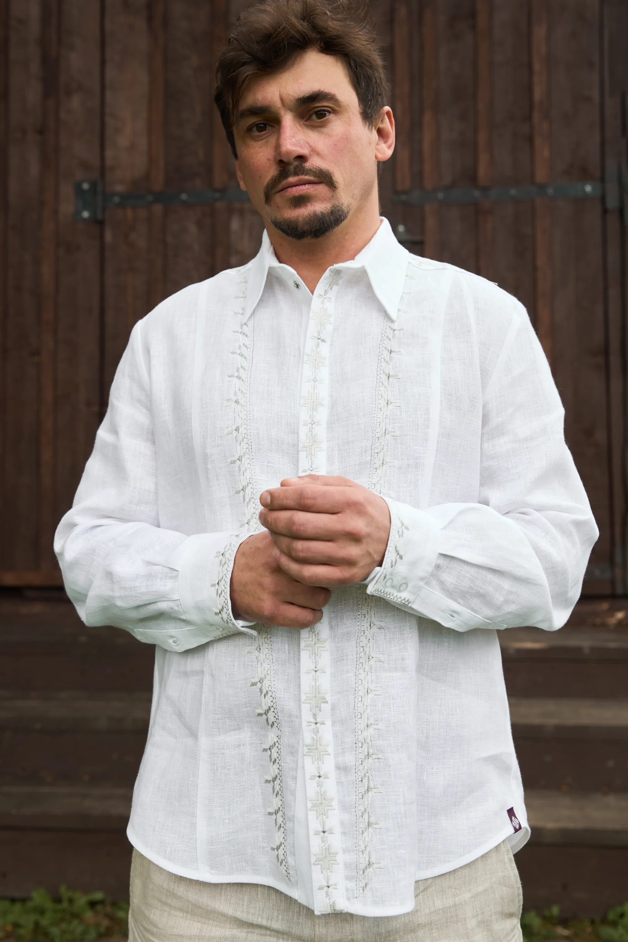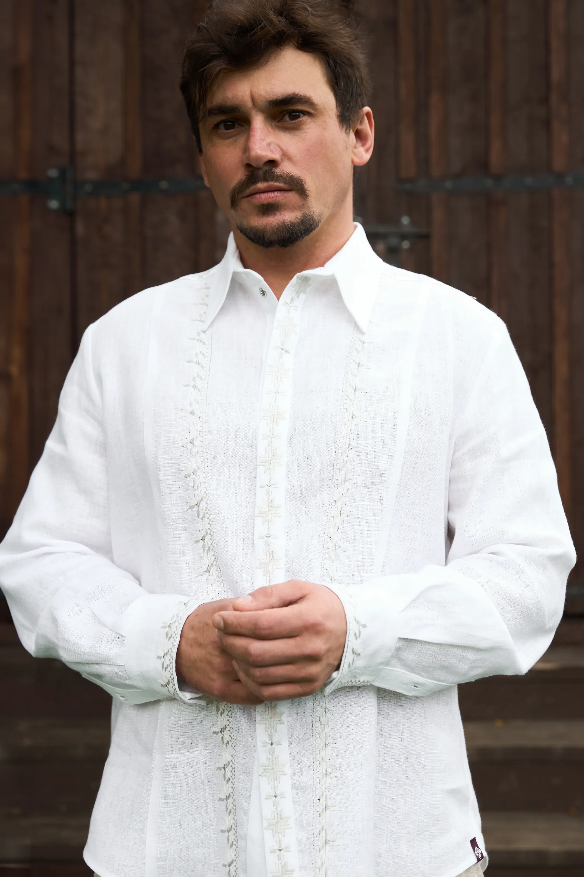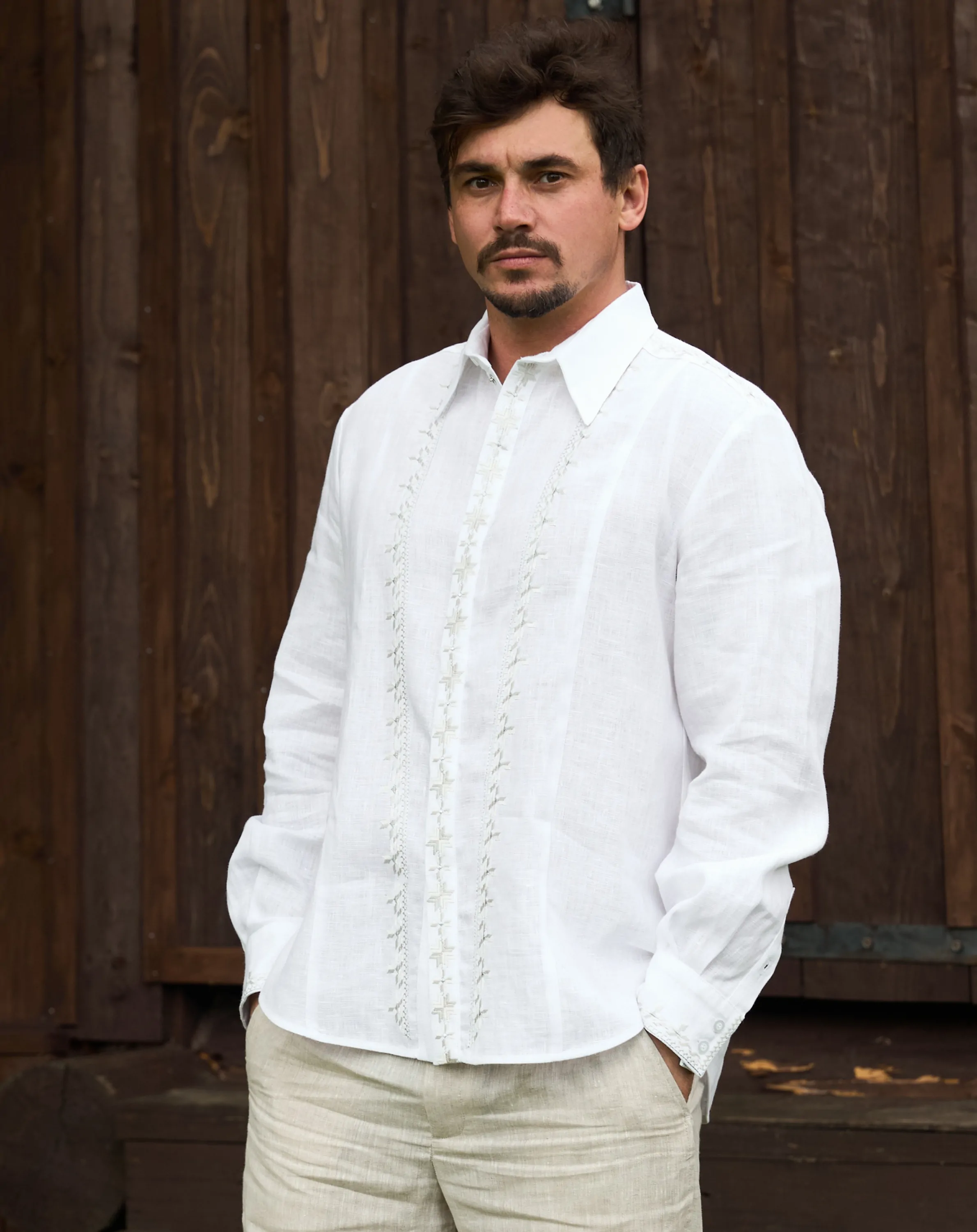 Чоловіча вишиванка з коміром-стійкою. Спереду сорочка застібається на кнопки, манжети – на ґудзики.