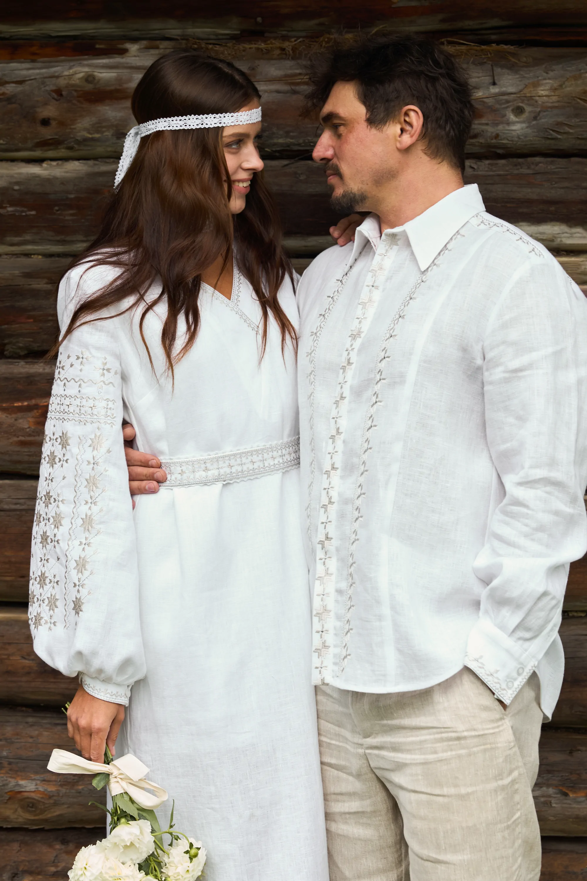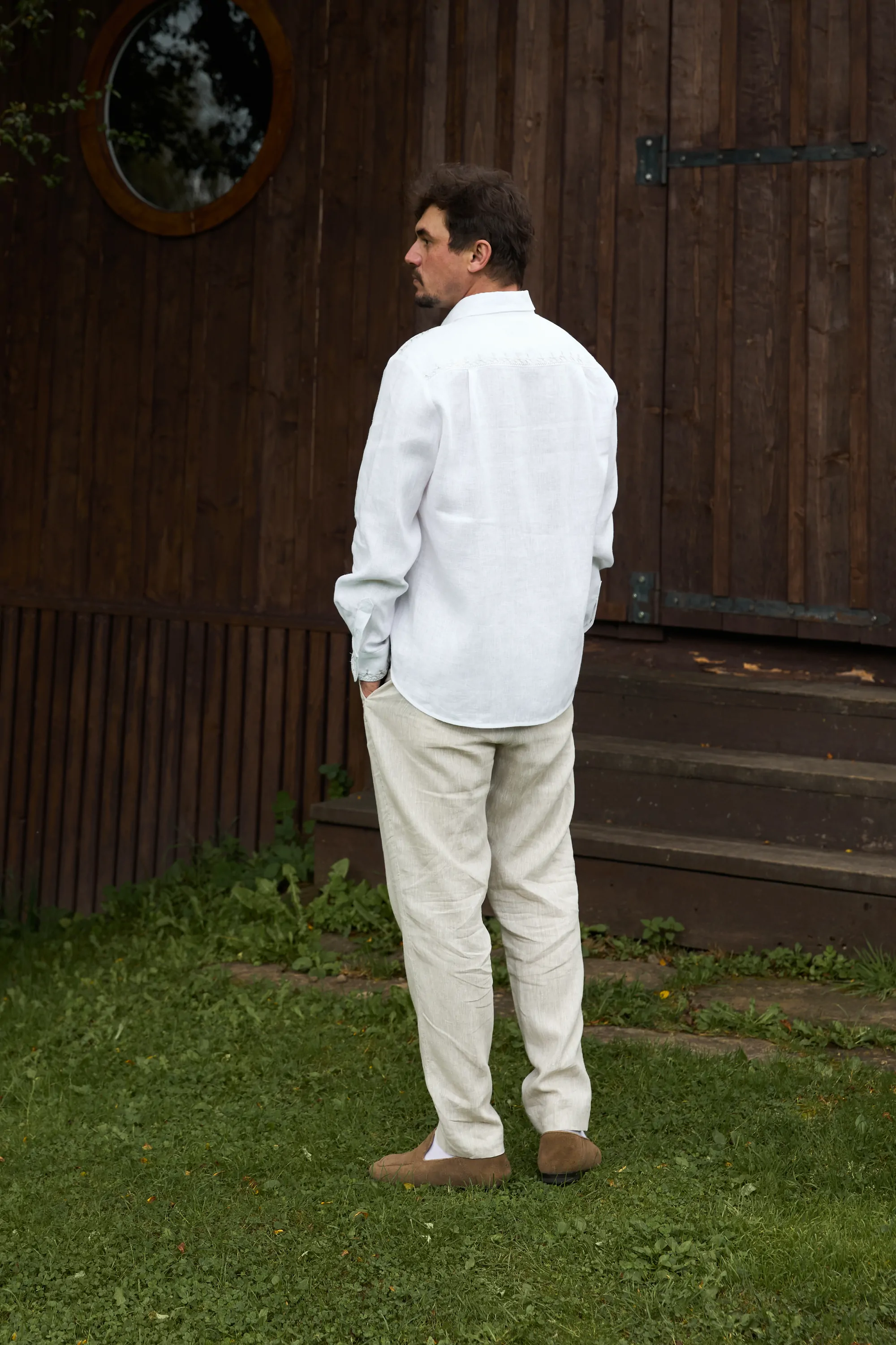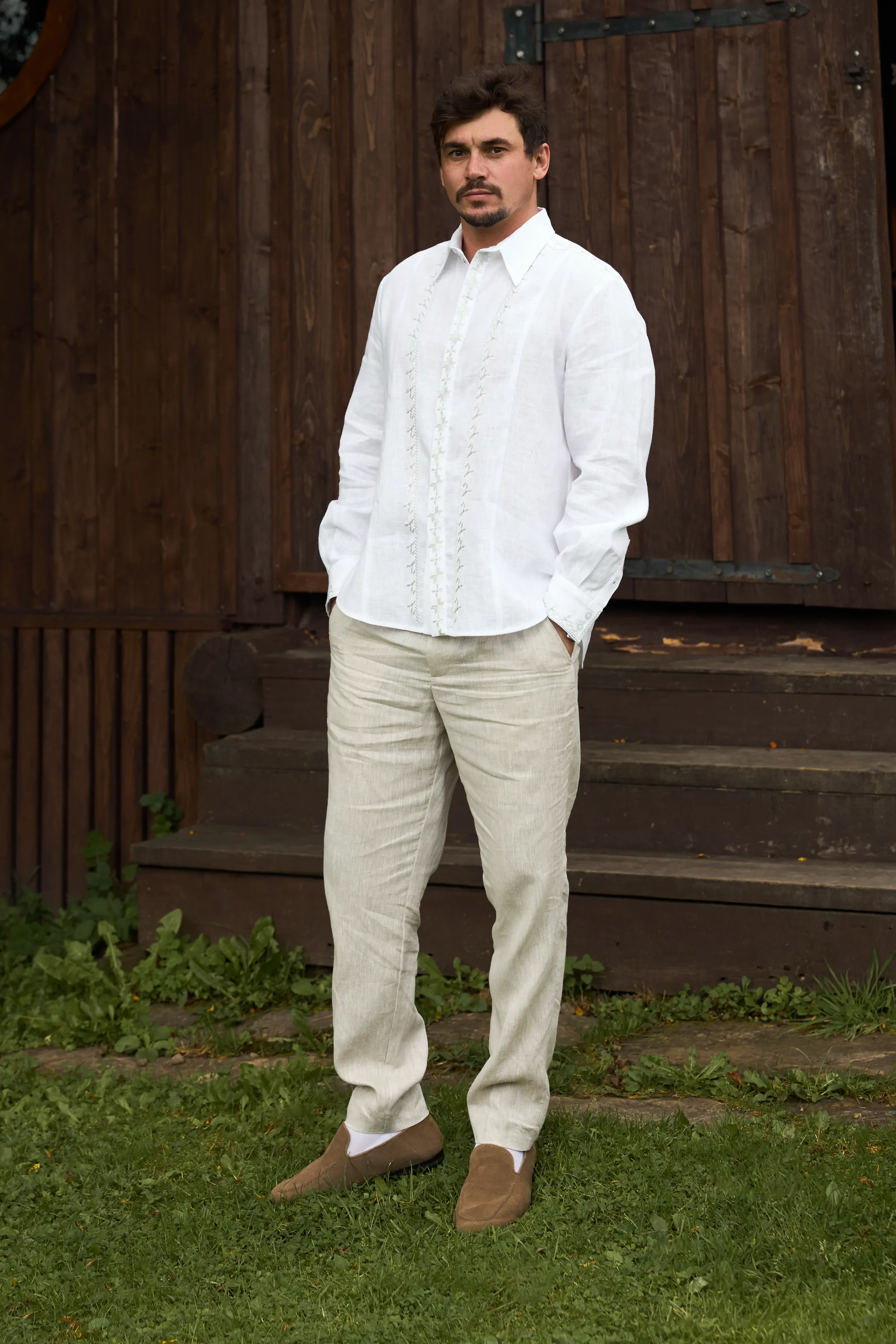 Чоловіча вишиванка з коміром-стійкою. Спереду сорочка застібається на кнопки, манжети – на ґудзики.
