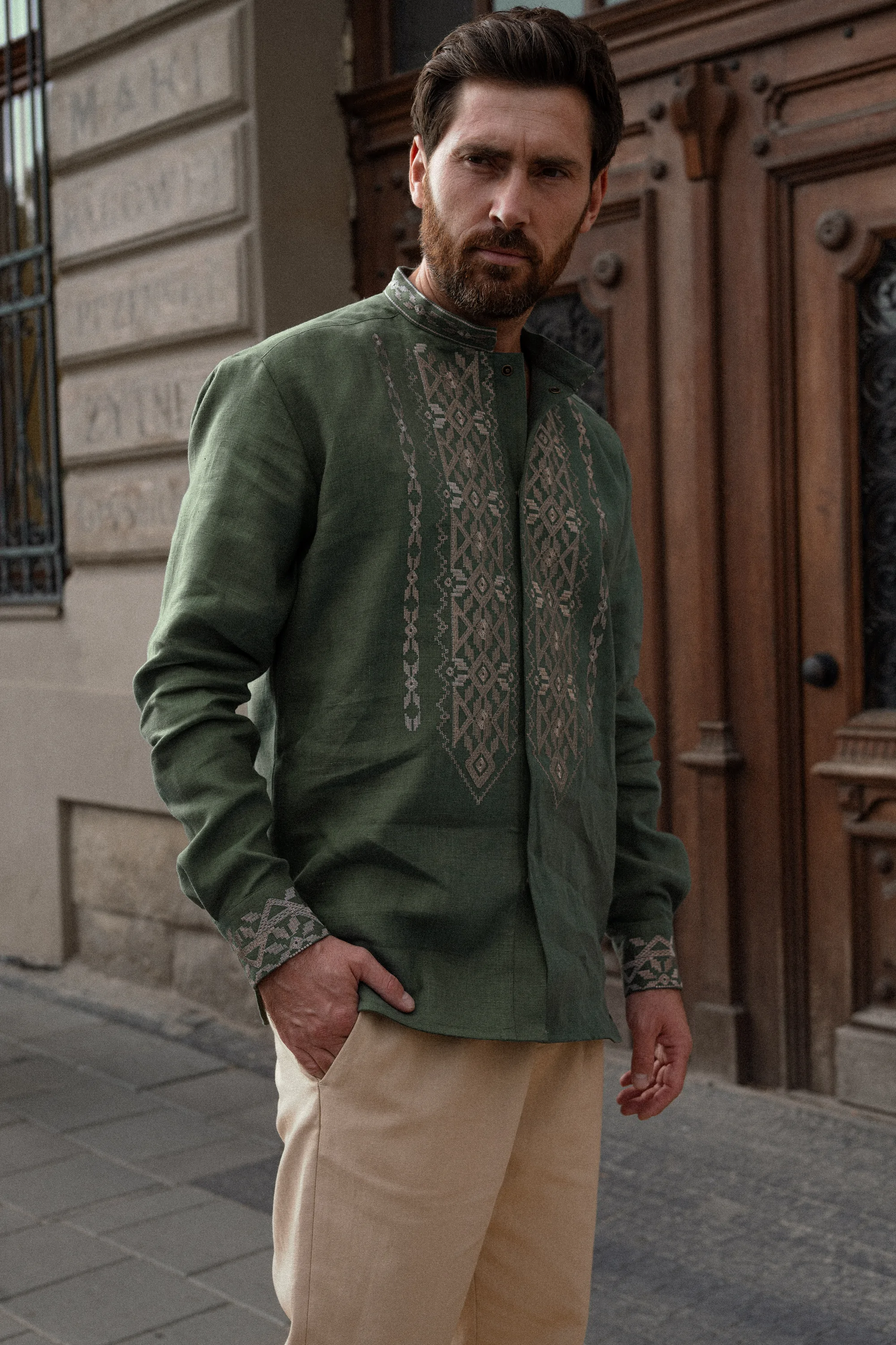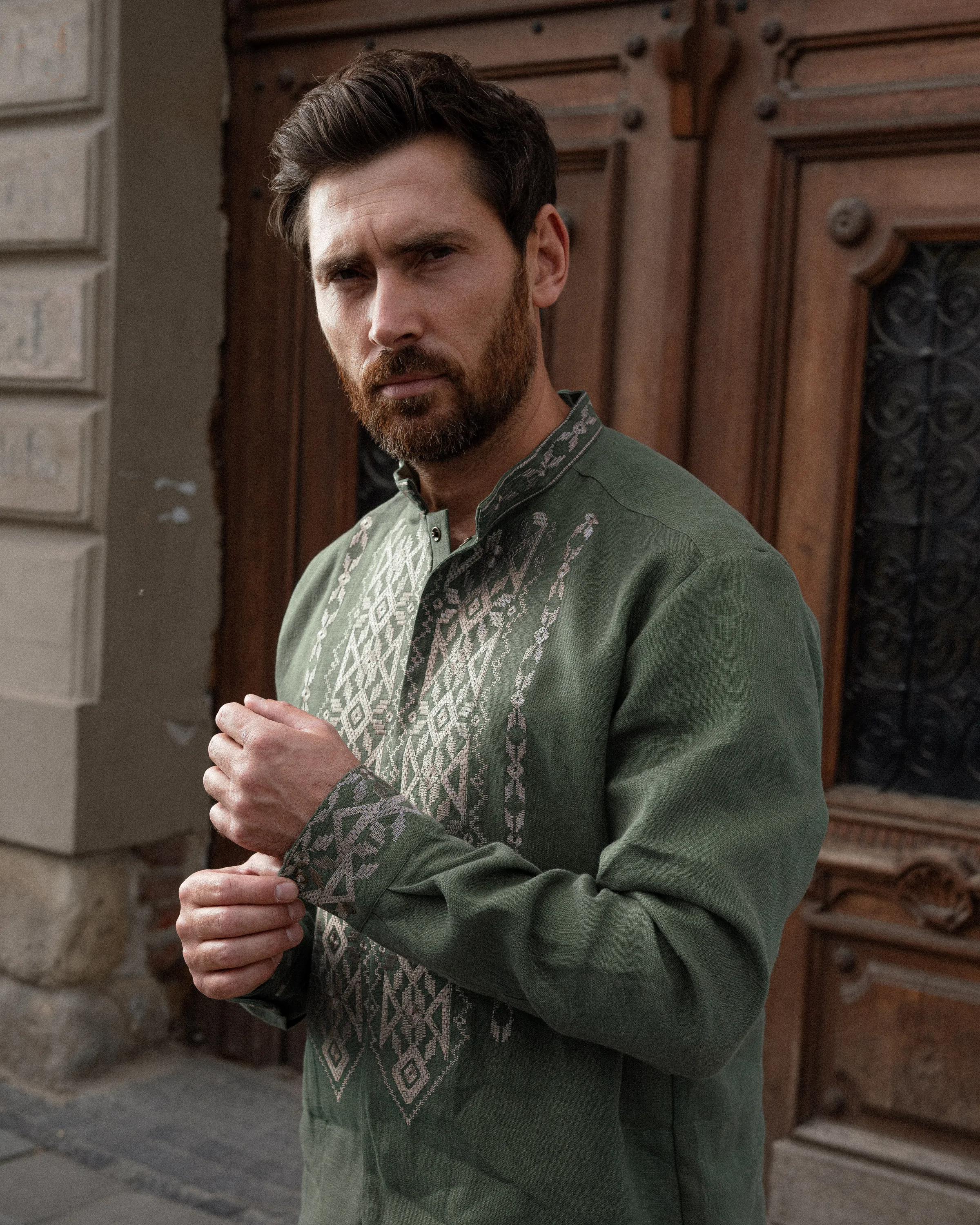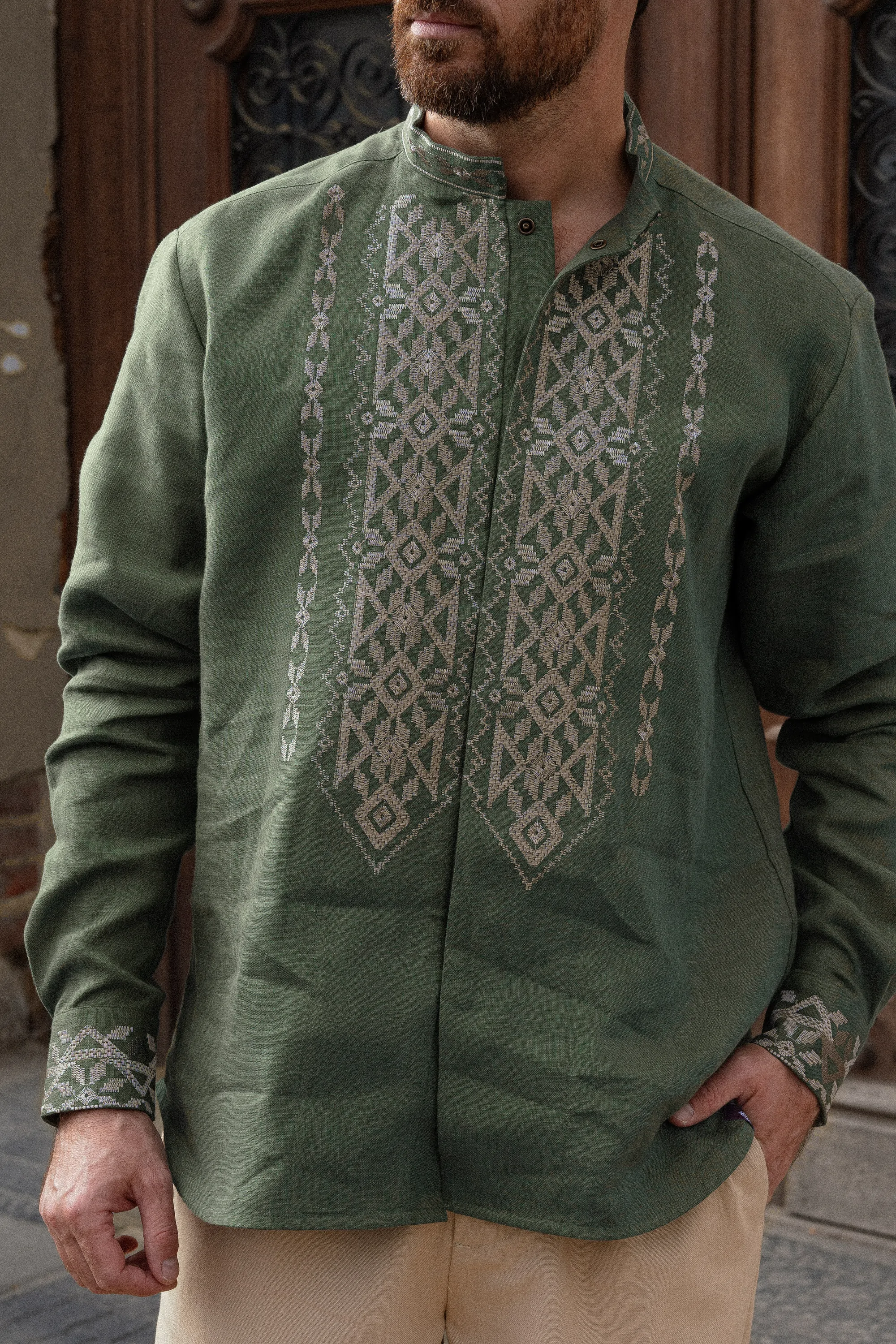 Сорочка застібається на кнопки спереду та на рукавах. В орнаменті переважають геометричні мотиви. Орнамент вишиванки походить зі Чернігівської області. Візерунок взято зі збірника “Українські народні вишивки” художниць І.Ф. Красницької та О.Г. Полюскевич.
