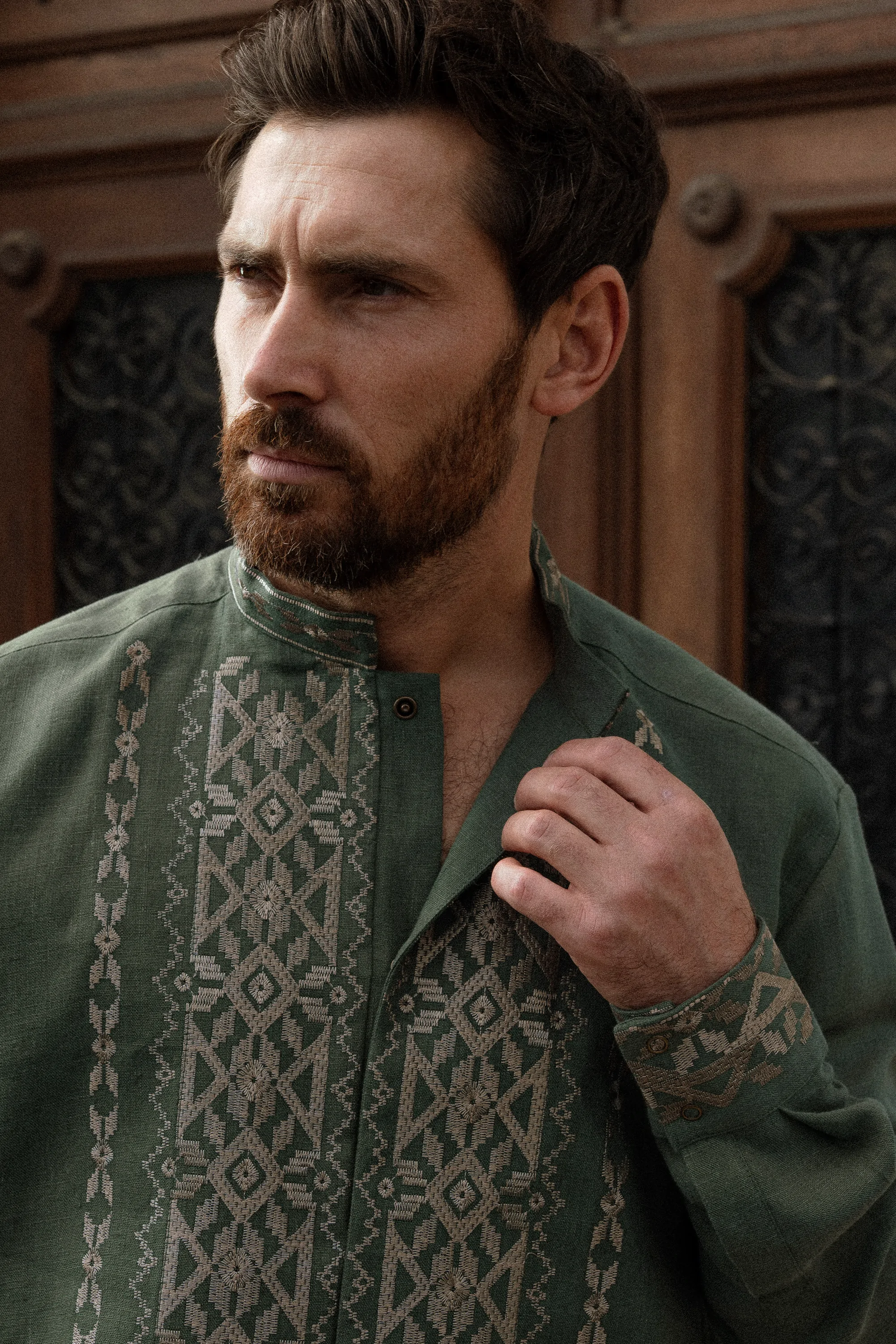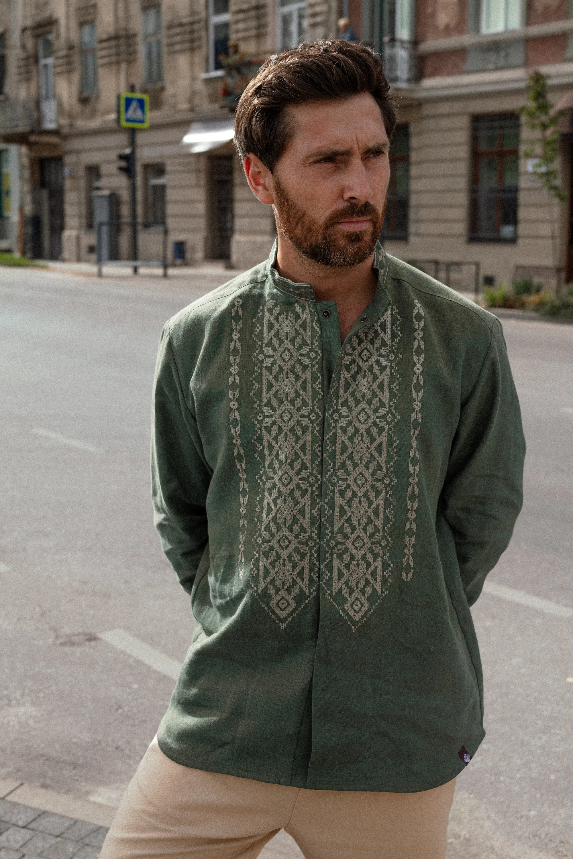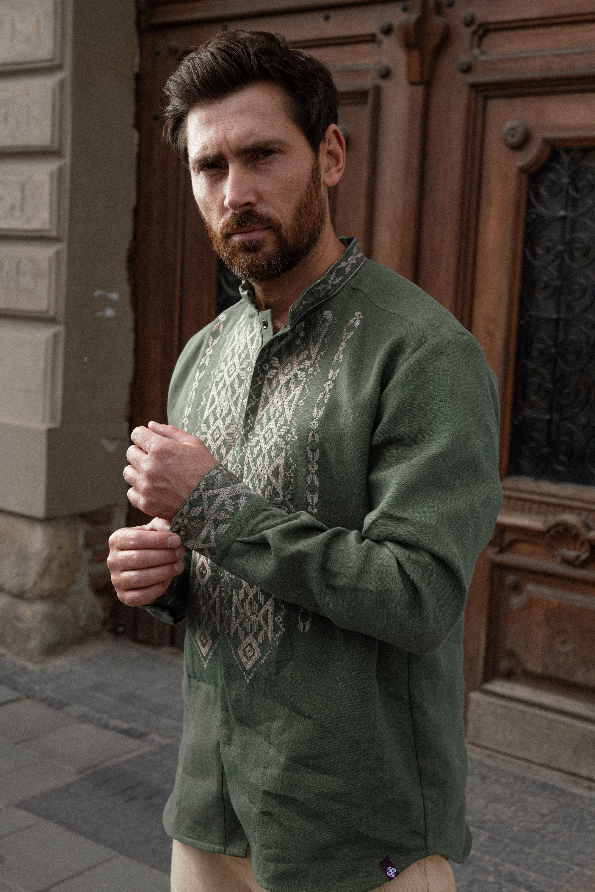 Сорочка застібається на кнопки спереду та на рукавах. В орнаменті переважають геометричні мотиви. Орнамент вишиванки походить зі Чернігівської області. Візерунок взято зі збірника “Українські народні вишивки” художниць І.Ф. Красницької та О.Г. Полюскевич.