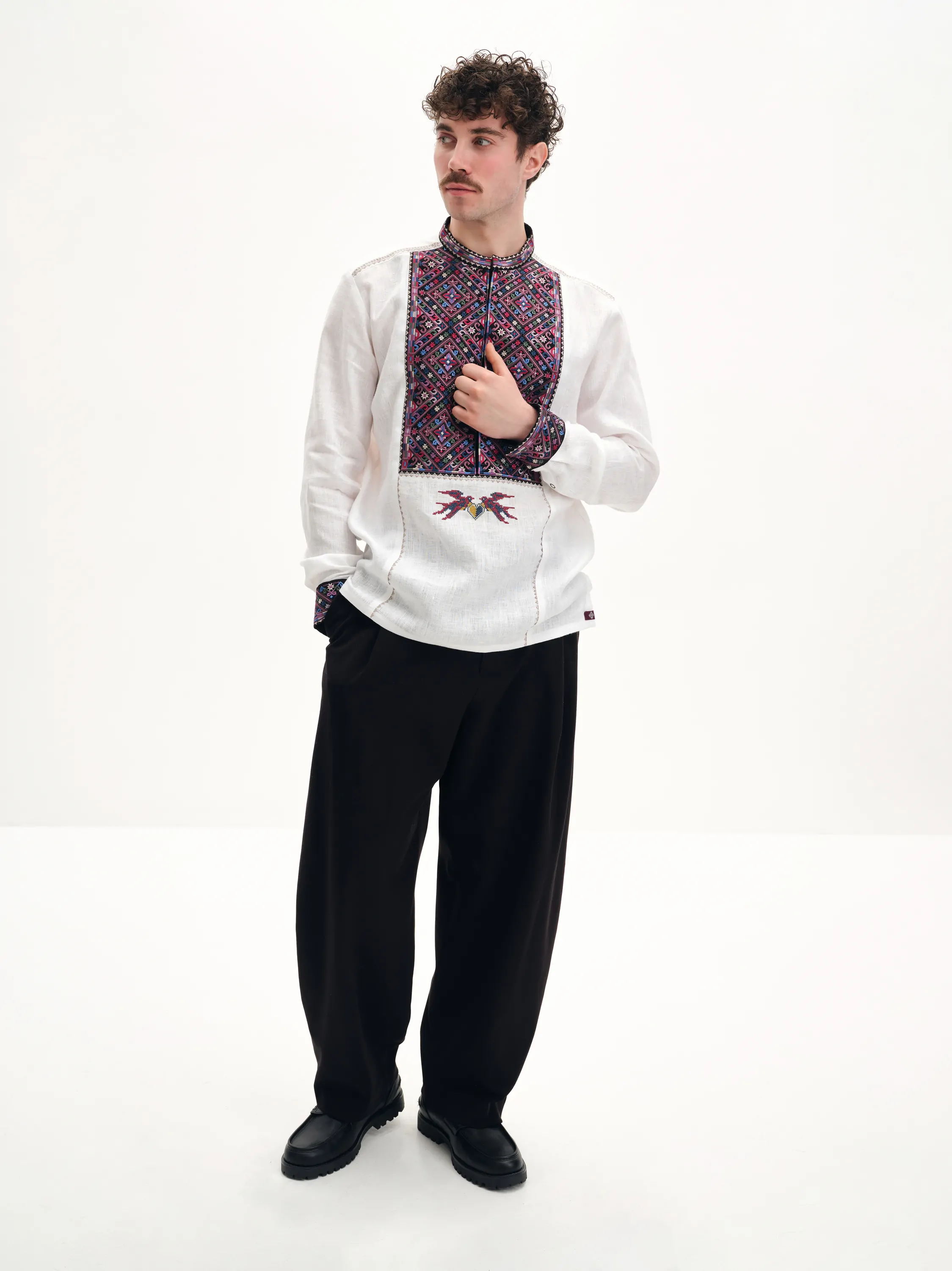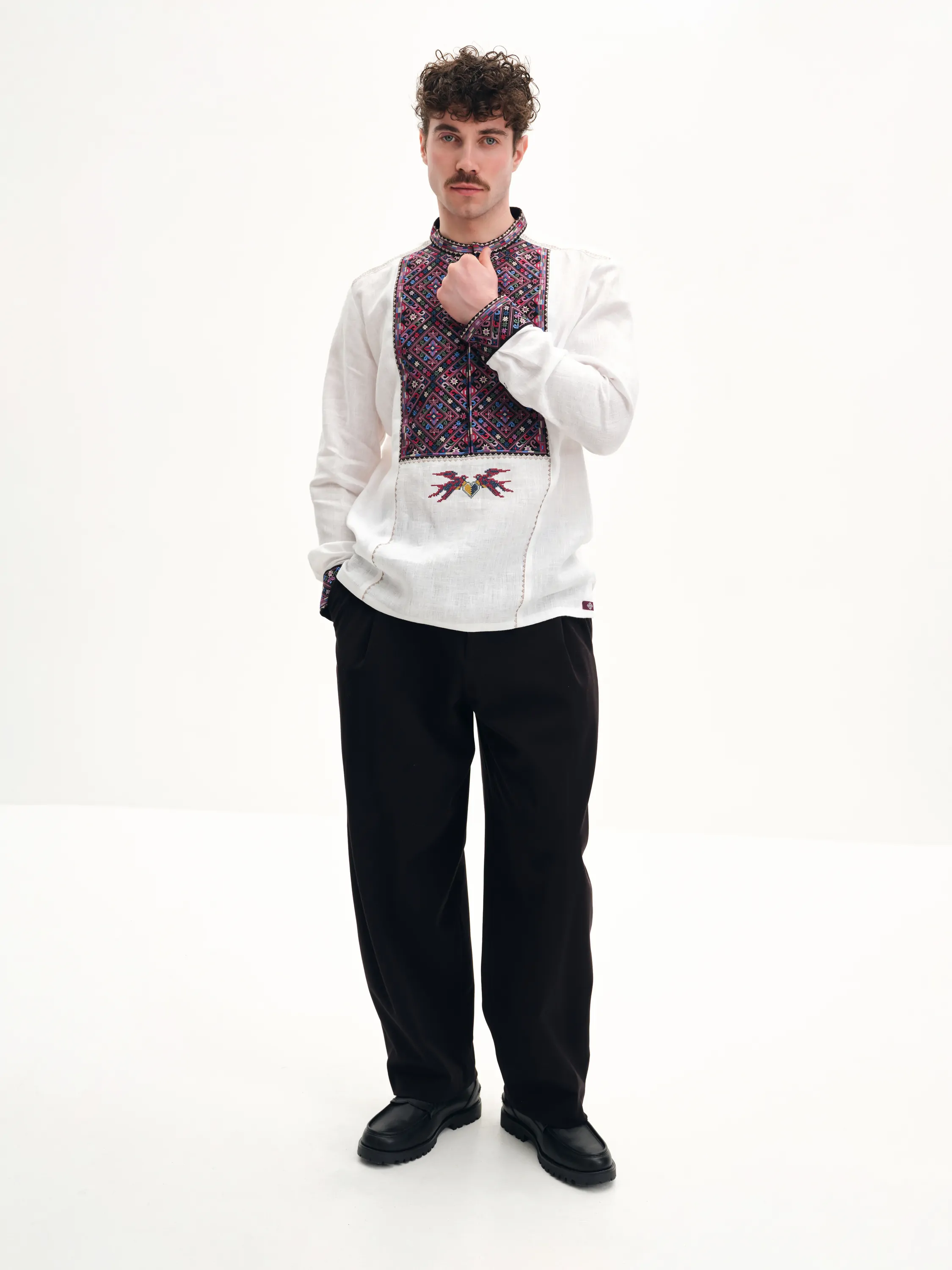 На вишиванці відтворений орнамент з етнографічного району Верховина – дві пташки, що тримають серце з синьо-жовтим стягом. Походження візерунка – з гуцульського району, село Верховина. Манжети на рукавах сорочки застібаються на кнопки.
