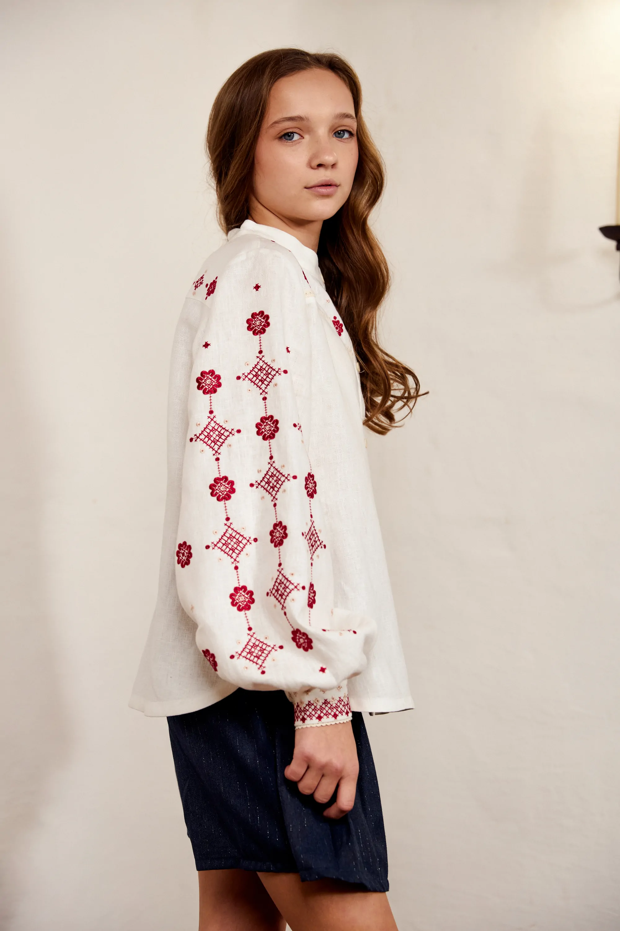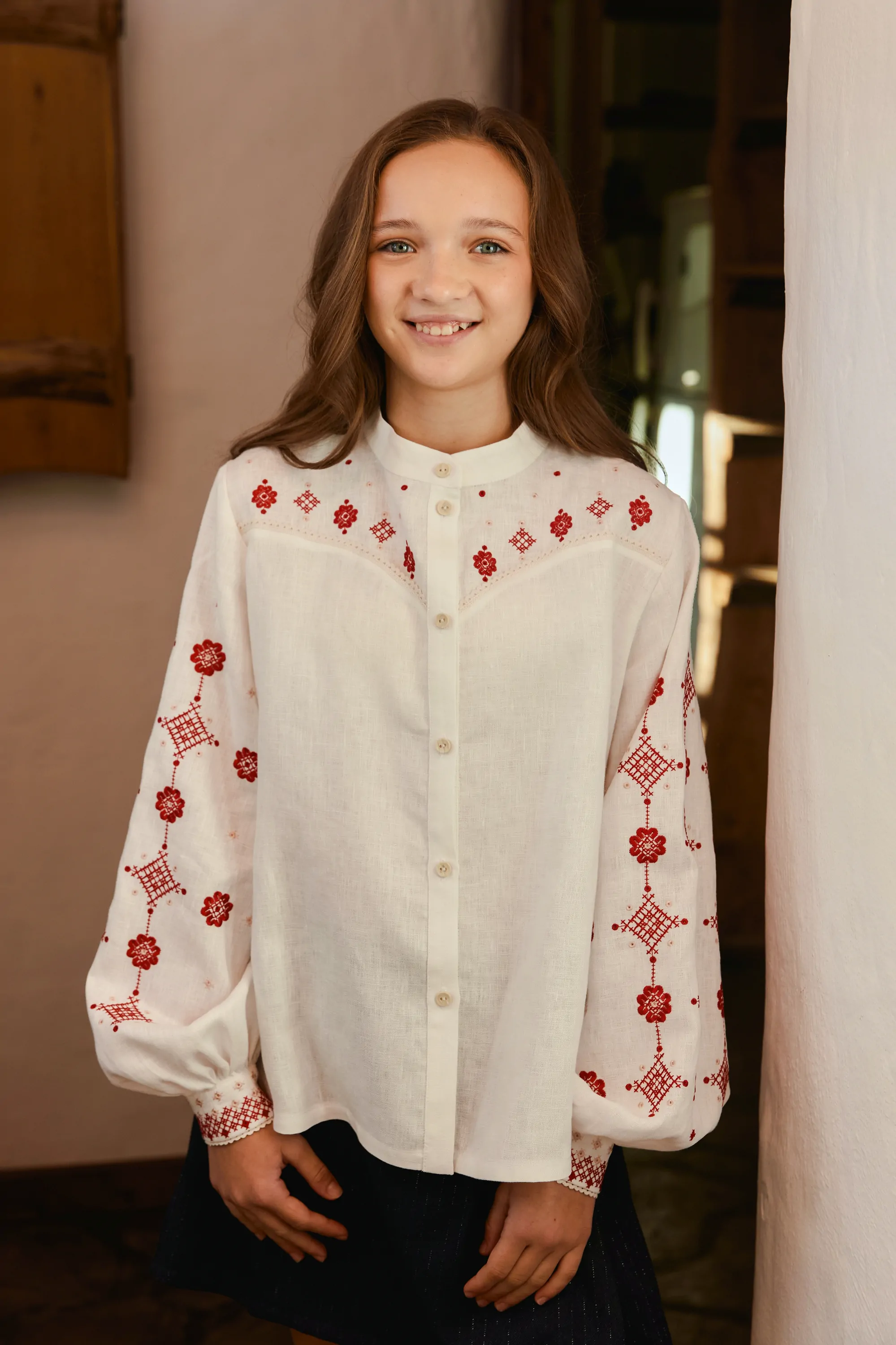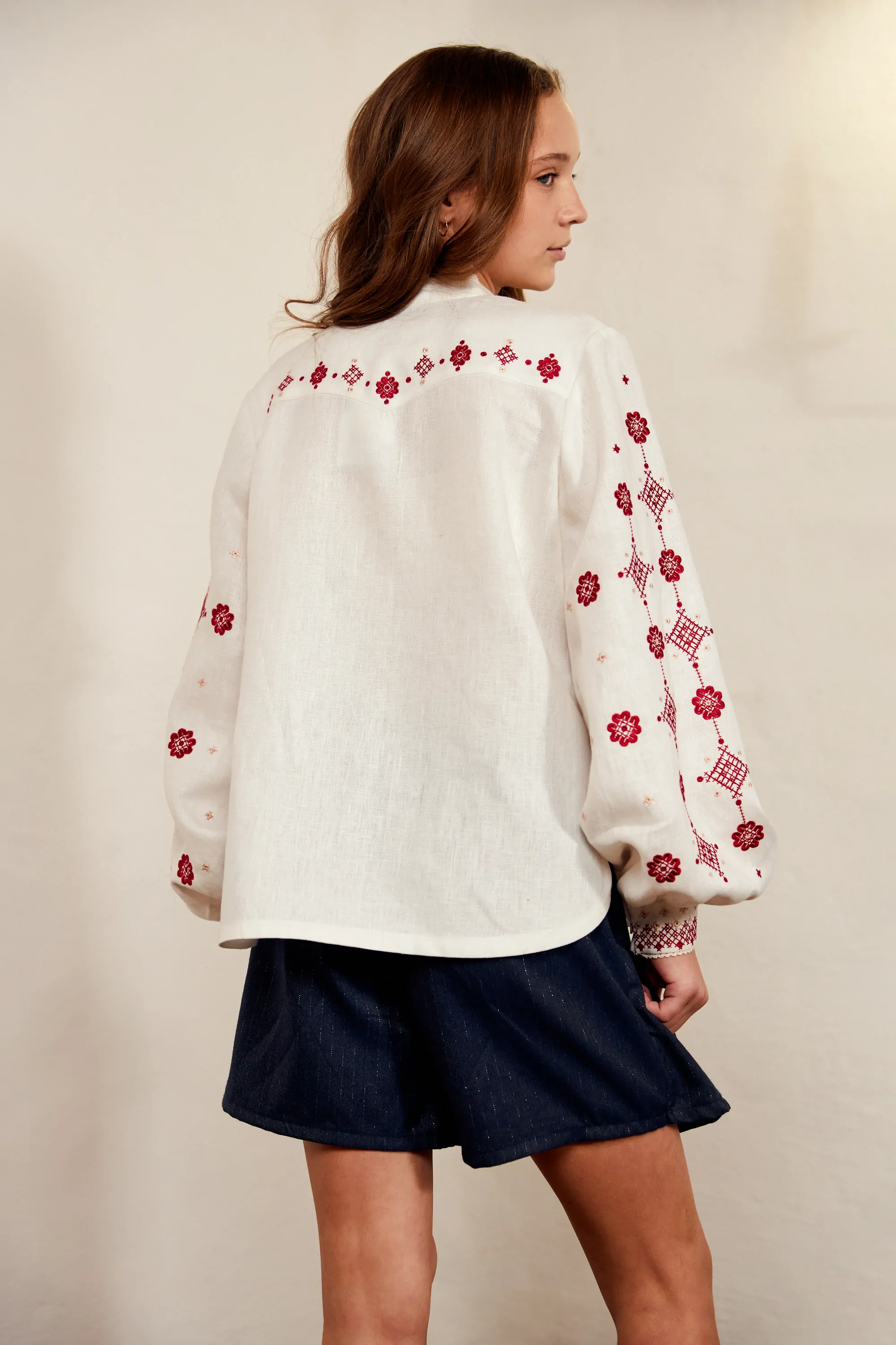 Блузка молочного кольору на ґудзики. Біля горловини та на рукавах розміщені червоні квіти й елементи, що нагадують зорі.