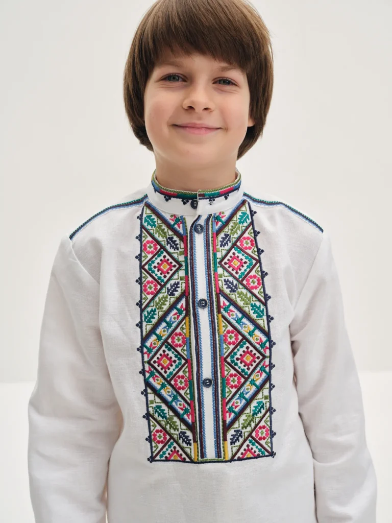 Дитяча вишиванка з колекції «Гуцулія». Сорочка має комір-стійку, застібається на ґудзики. Погруддя вишите геометричним орнаментом з рослинними мотивами, що характерне для гуцульської вишивки. Орнамент на сорочці походить зі села Криворівня, що на Прикарпатті.