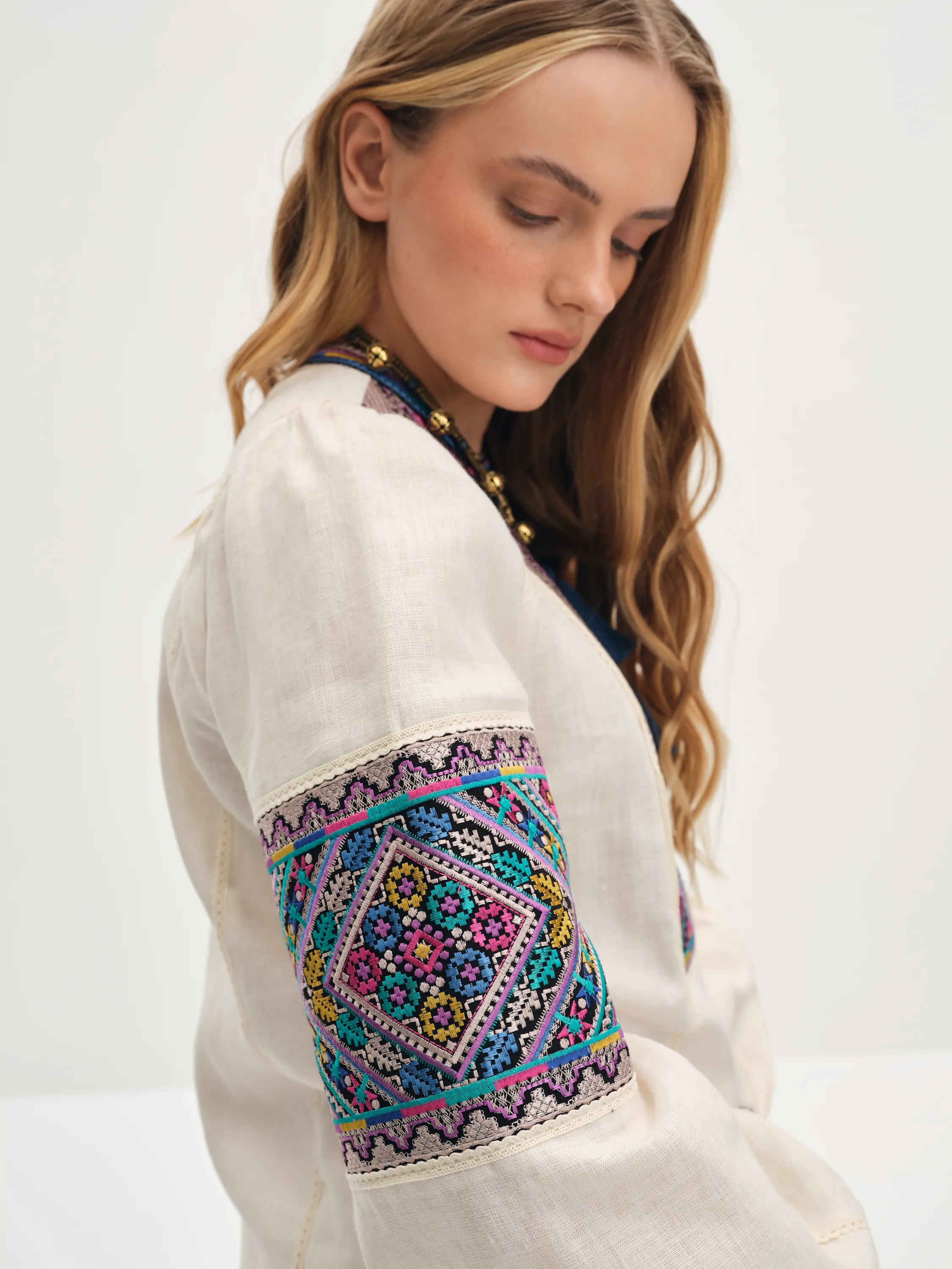 На виробі відтворено машинною вишивкою техніку вишиття «низинку».Виріб зав’язується на китиці, на манжетах застібається на гудзики.
