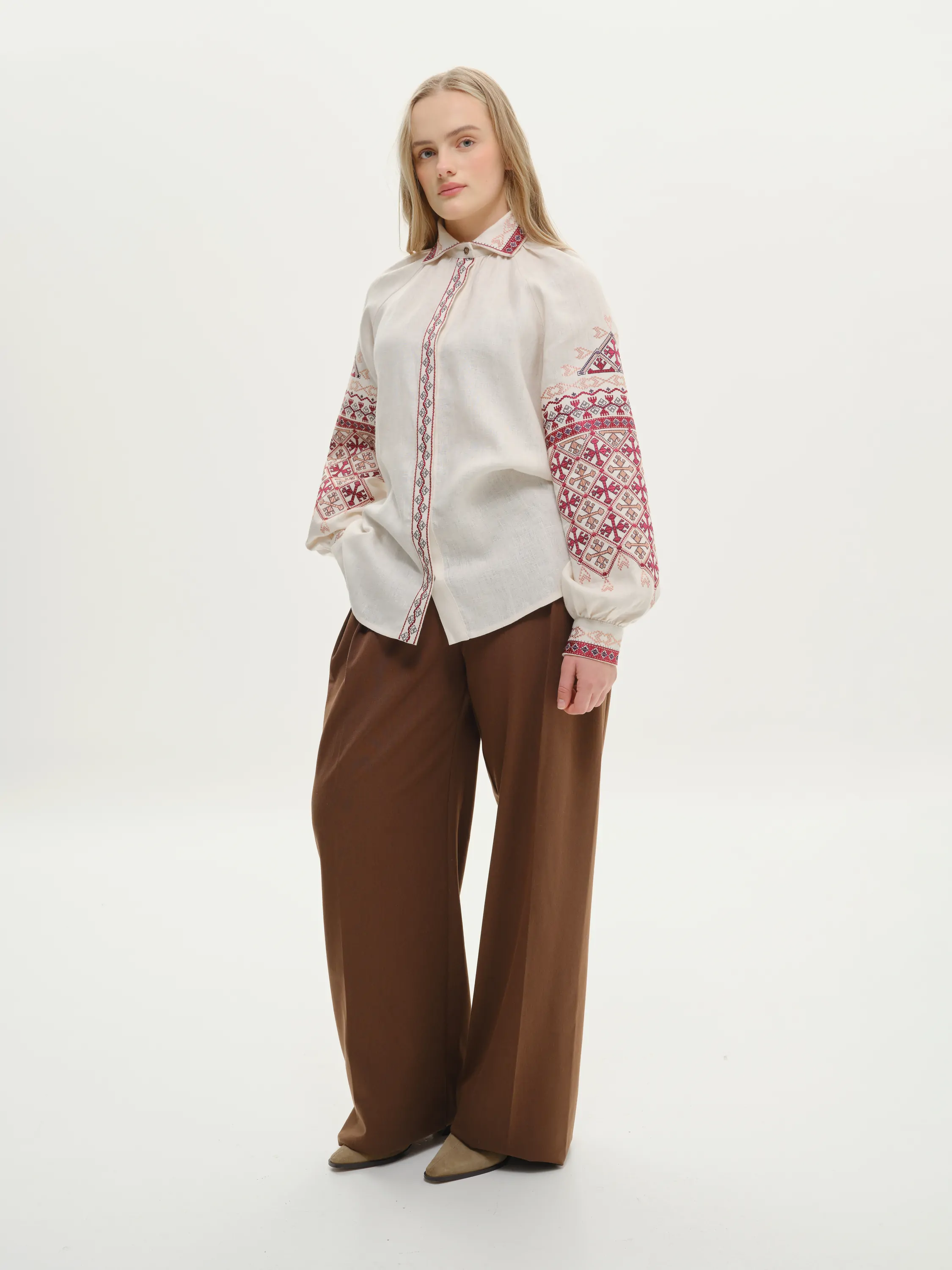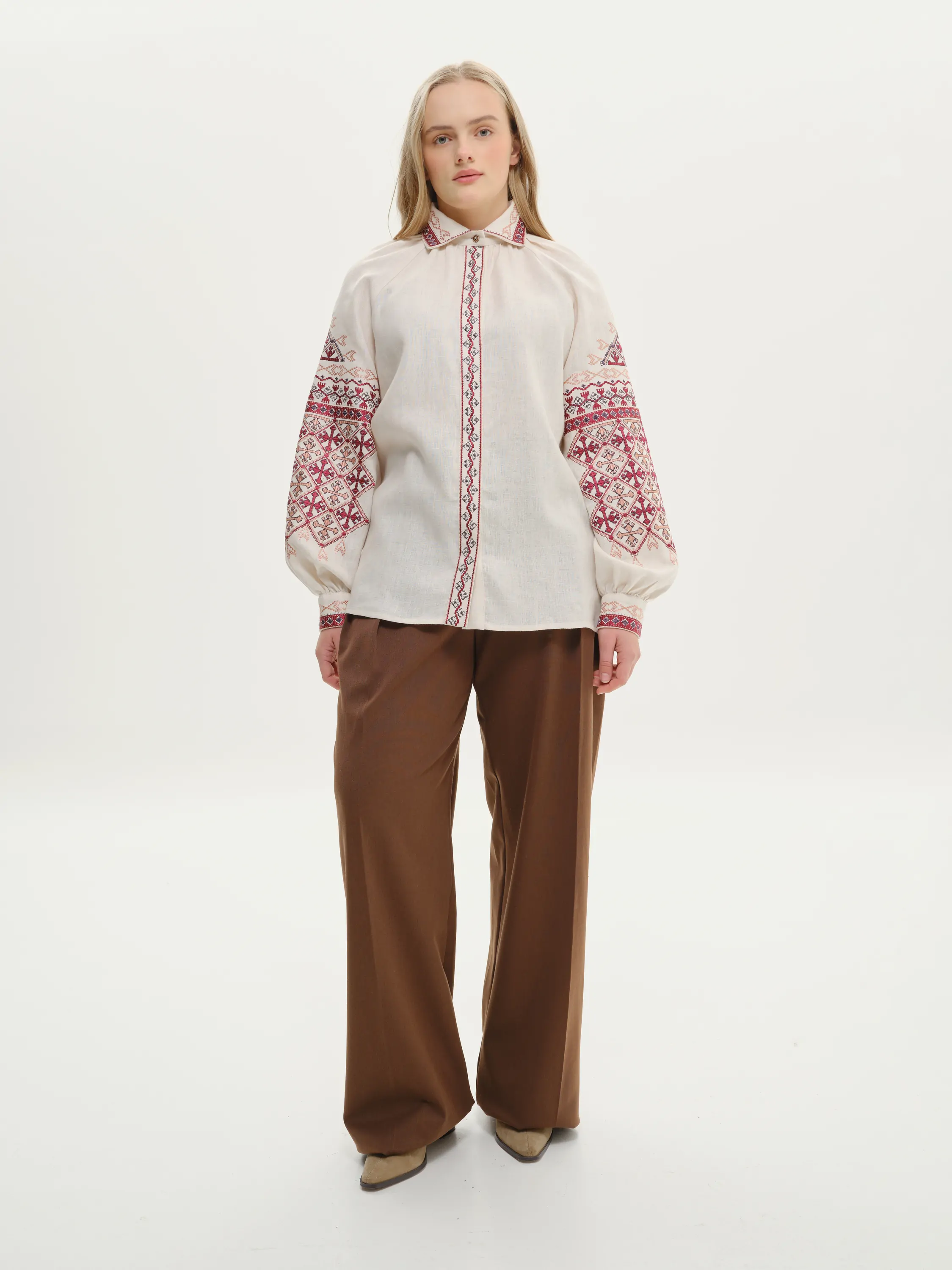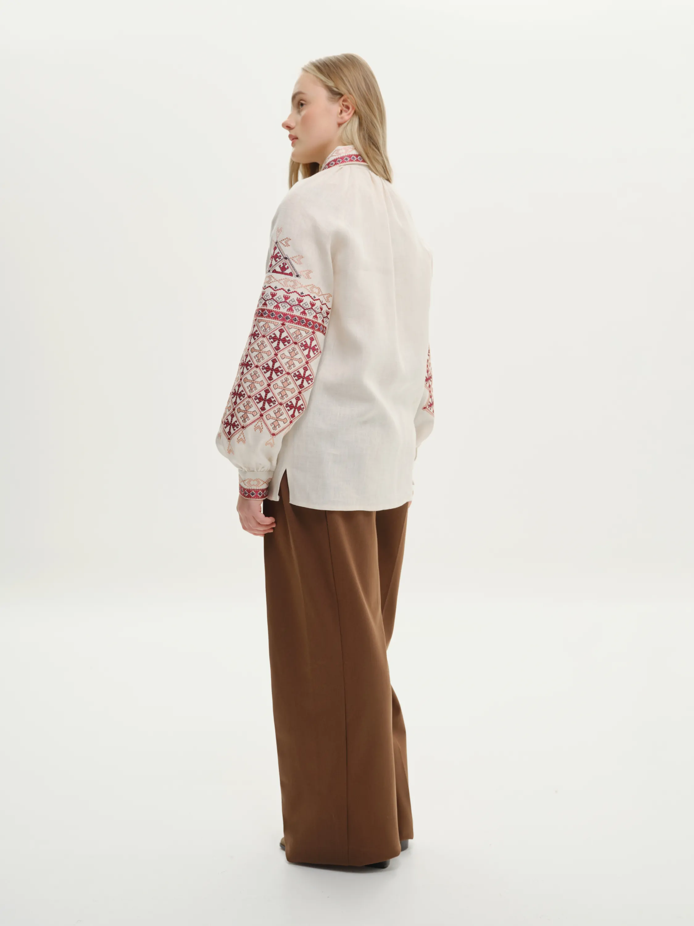 В орнаменті переважають геометричні фігури. Сорочка спереду та на манжетах застібається на приховані ґудзики. Візерунок створено машинною вишивкою з імітацією ручних технік вишиття.