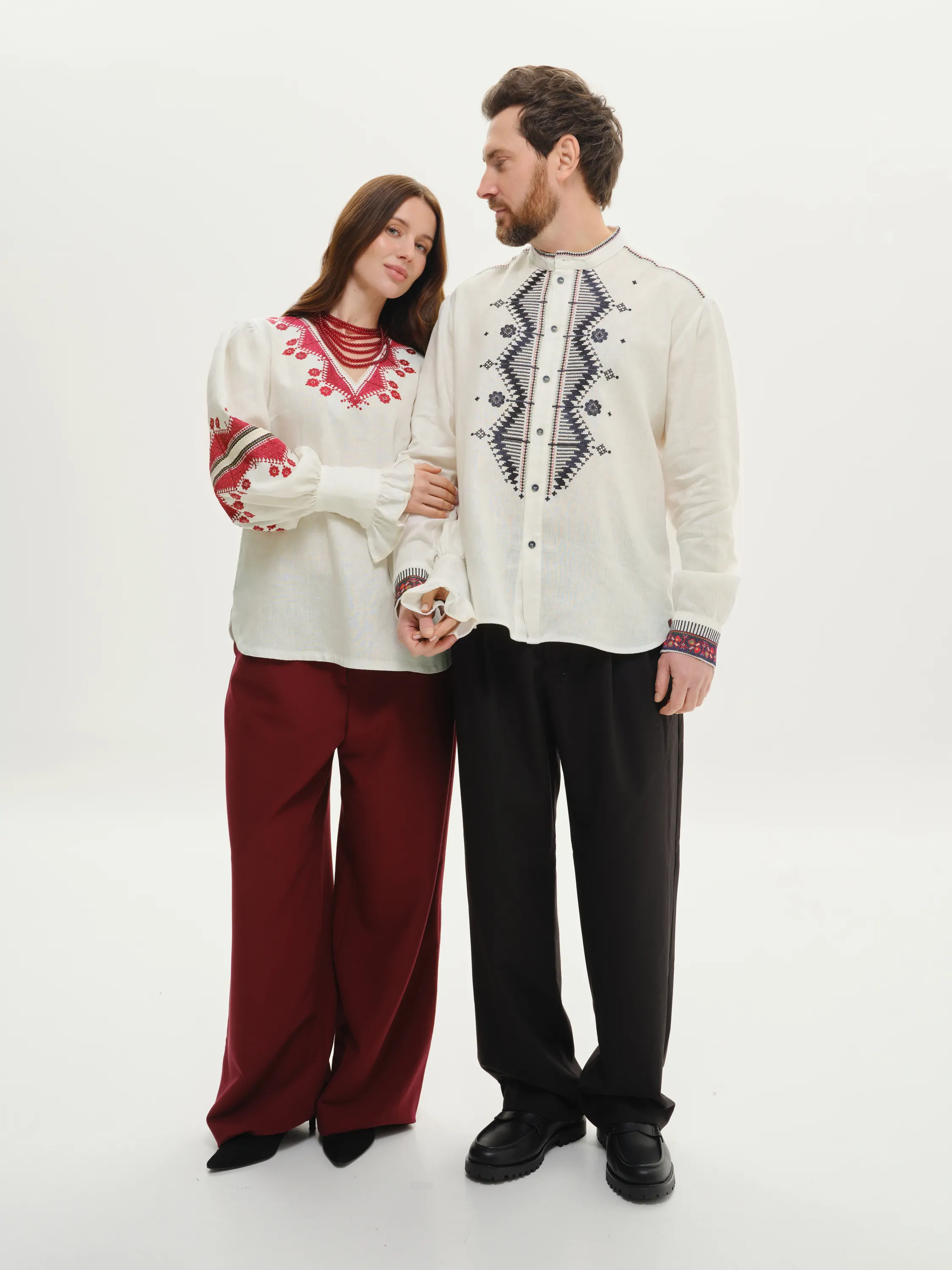 Біла блузка з V-подібним вирізом та червоним орнаментом у зоні комірця. Рукави мають манжети з ґудзиками та оздоблення в зоні ліктів.