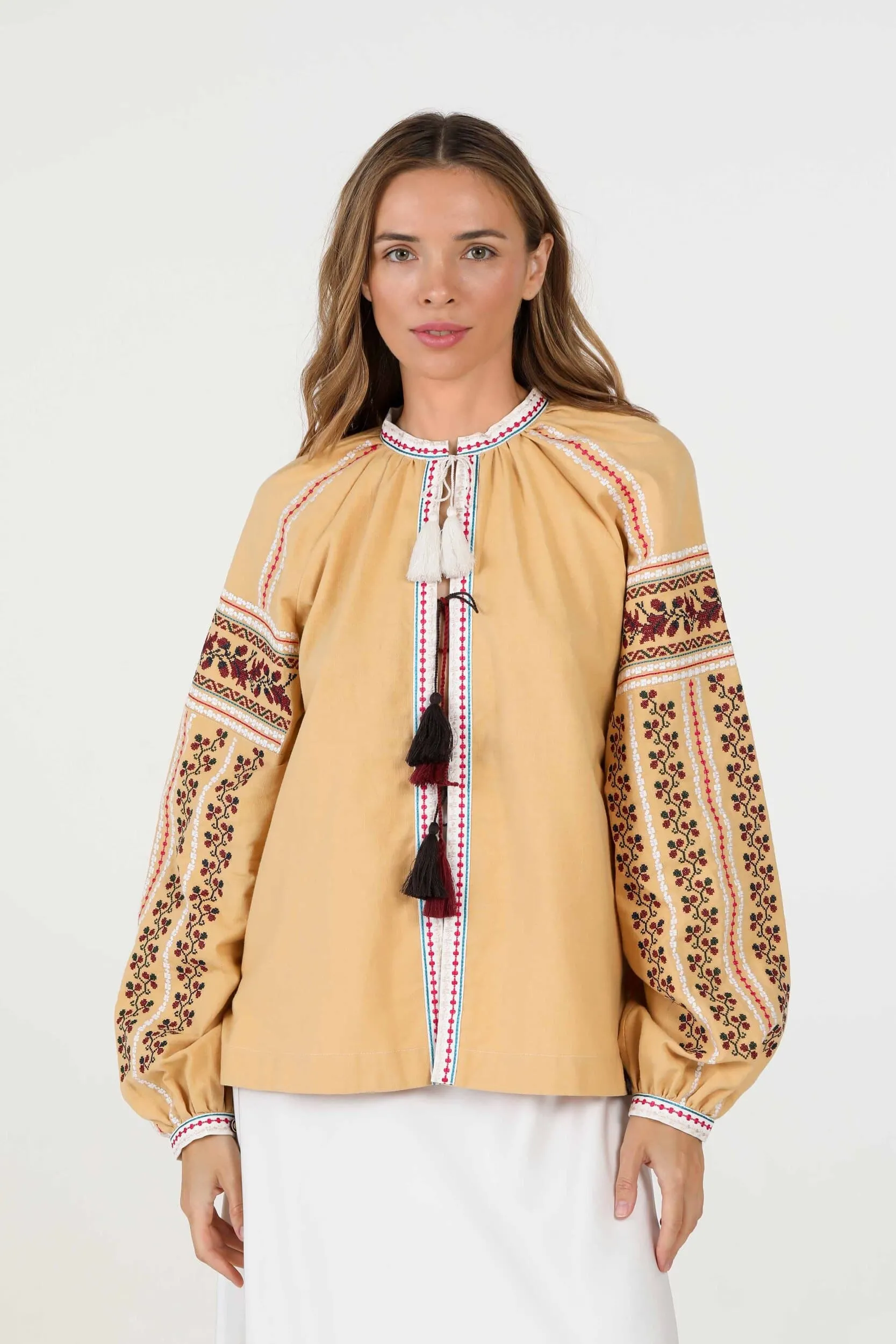 Сорочка спереду застібається на три пари китиці, які розташовані по всій довжині розрізу. Манжети рукавів застібаються на ґудзики.
