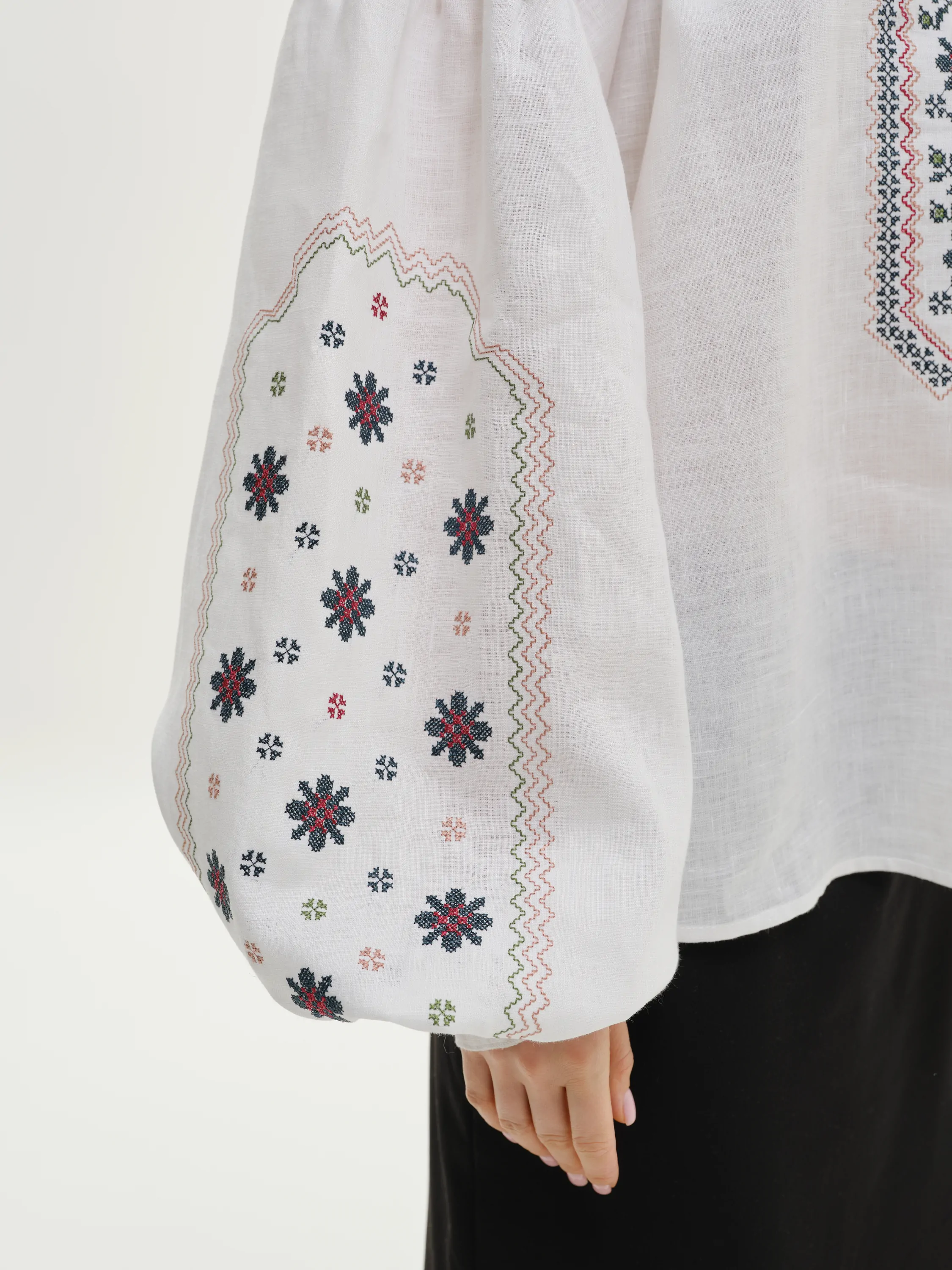 Орнамент походить з вишиванки початку XX століття з села Троєщина, Броварського району, Київської області. Експонат, з якого відтворено взір, зберігається у фондах Національного музею архітектури та побуту України.