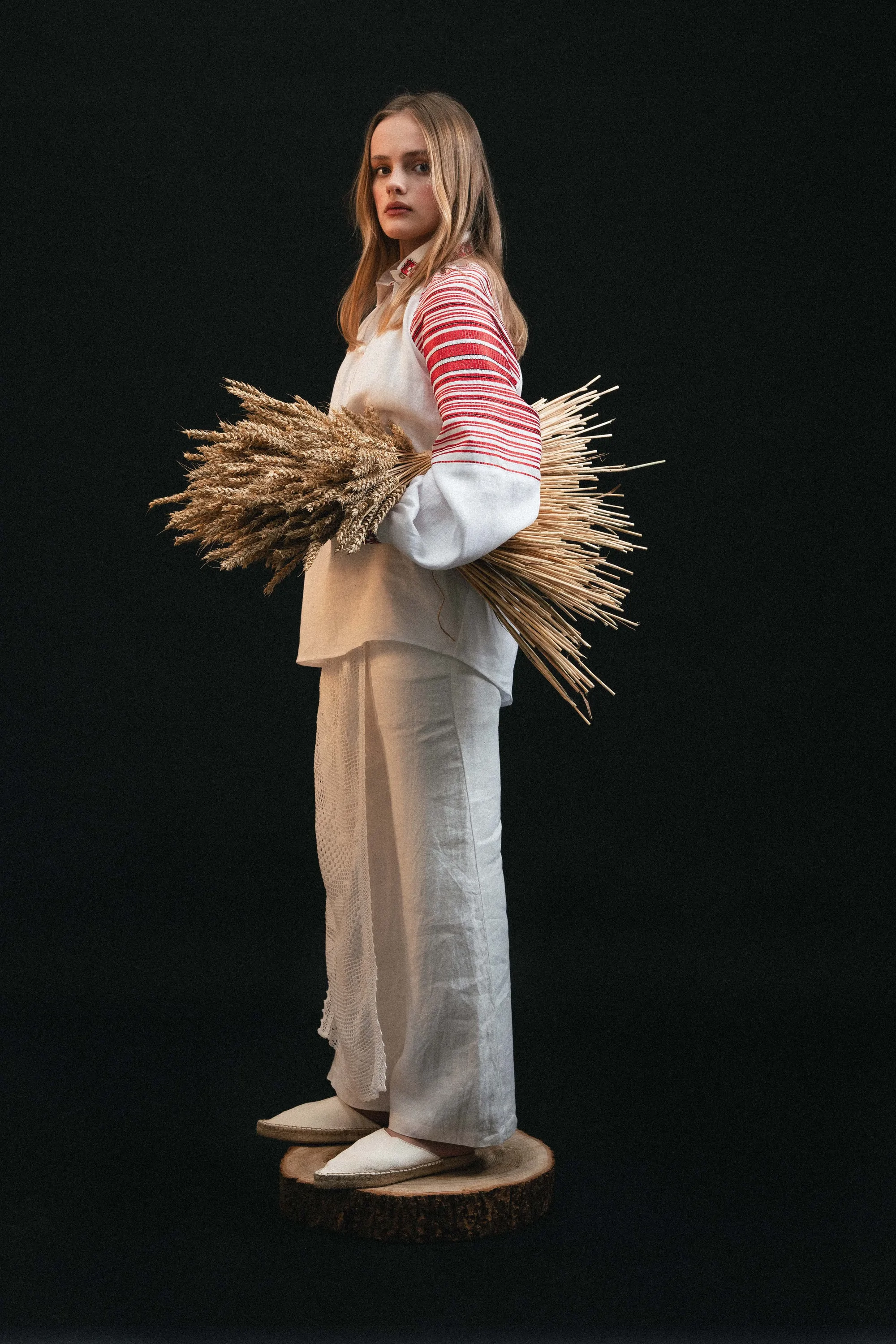 Орнамент сорочки відтворено з вишиванки, яку виткала на домашньому станку та вишила своїми руками рідна бабуся засновниці бренду SVARGA. Взір походить з українського селища на Поліссі.