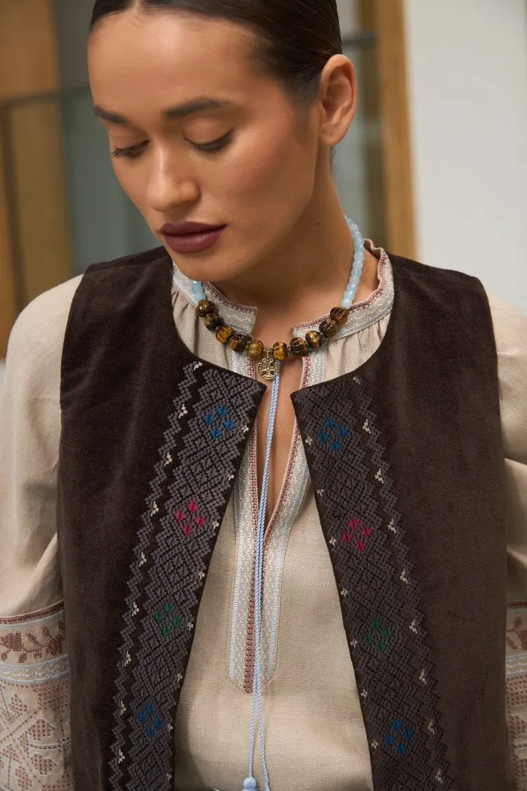 На фото жилетку стилізовано з вишиванкою Настасія.