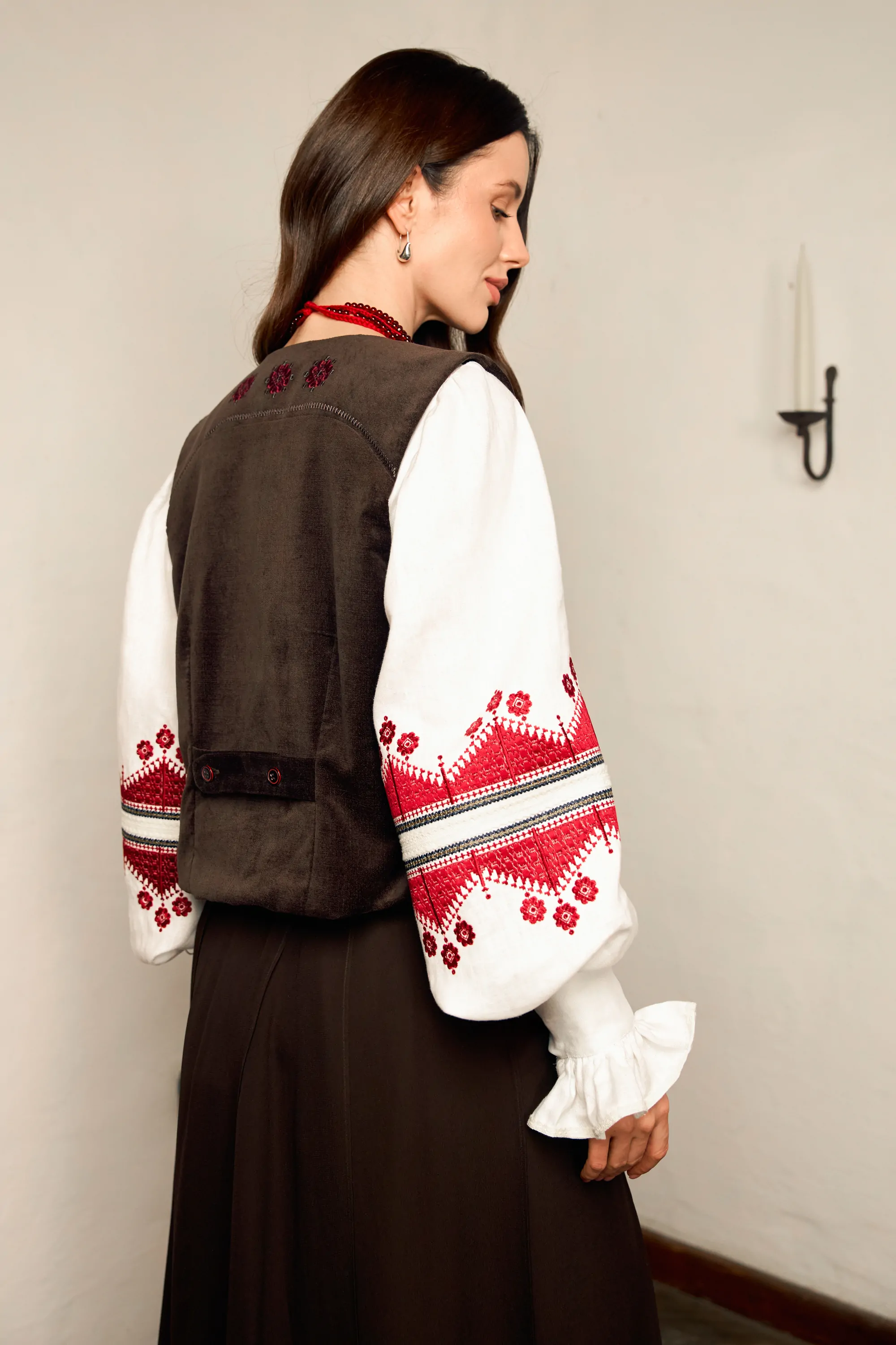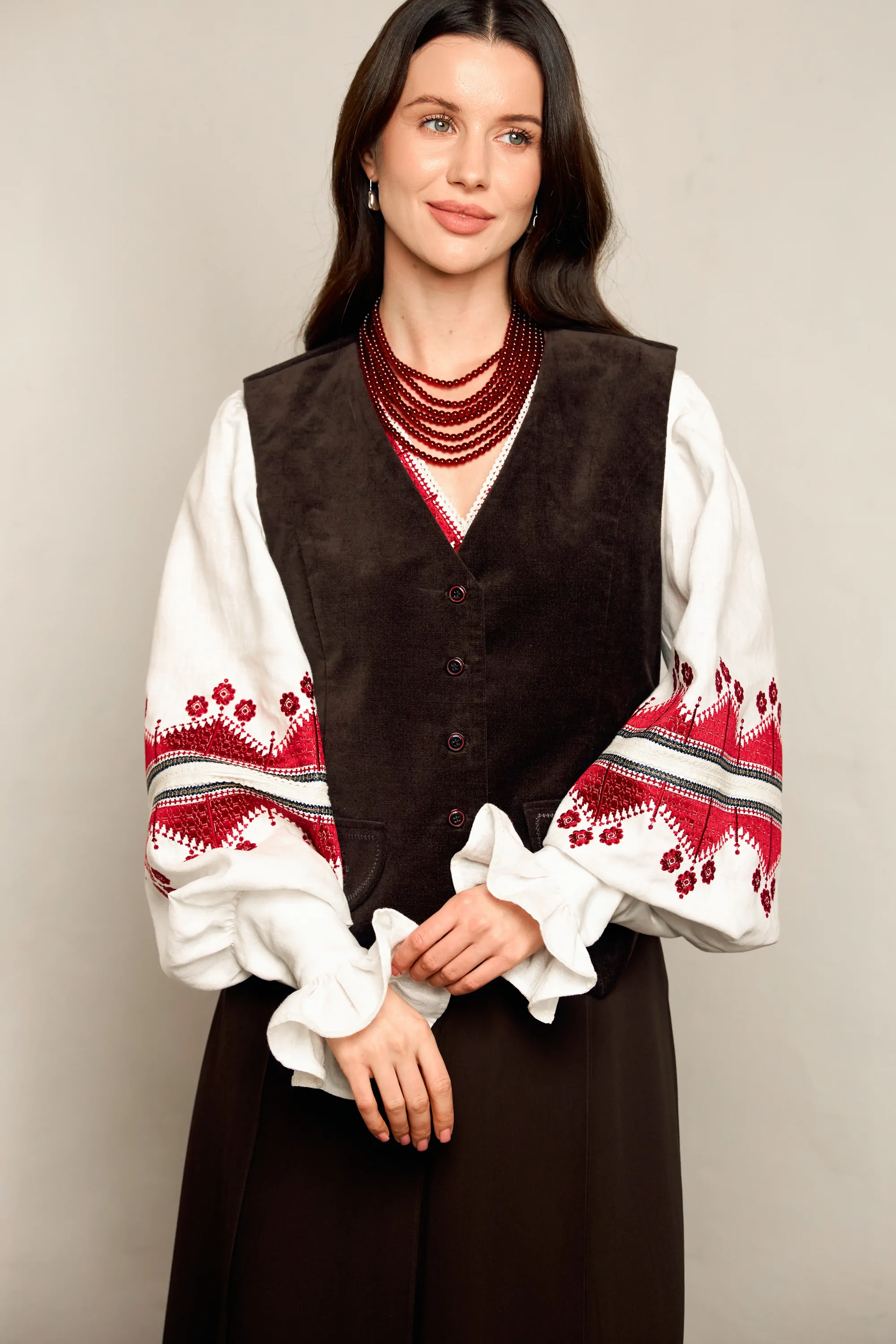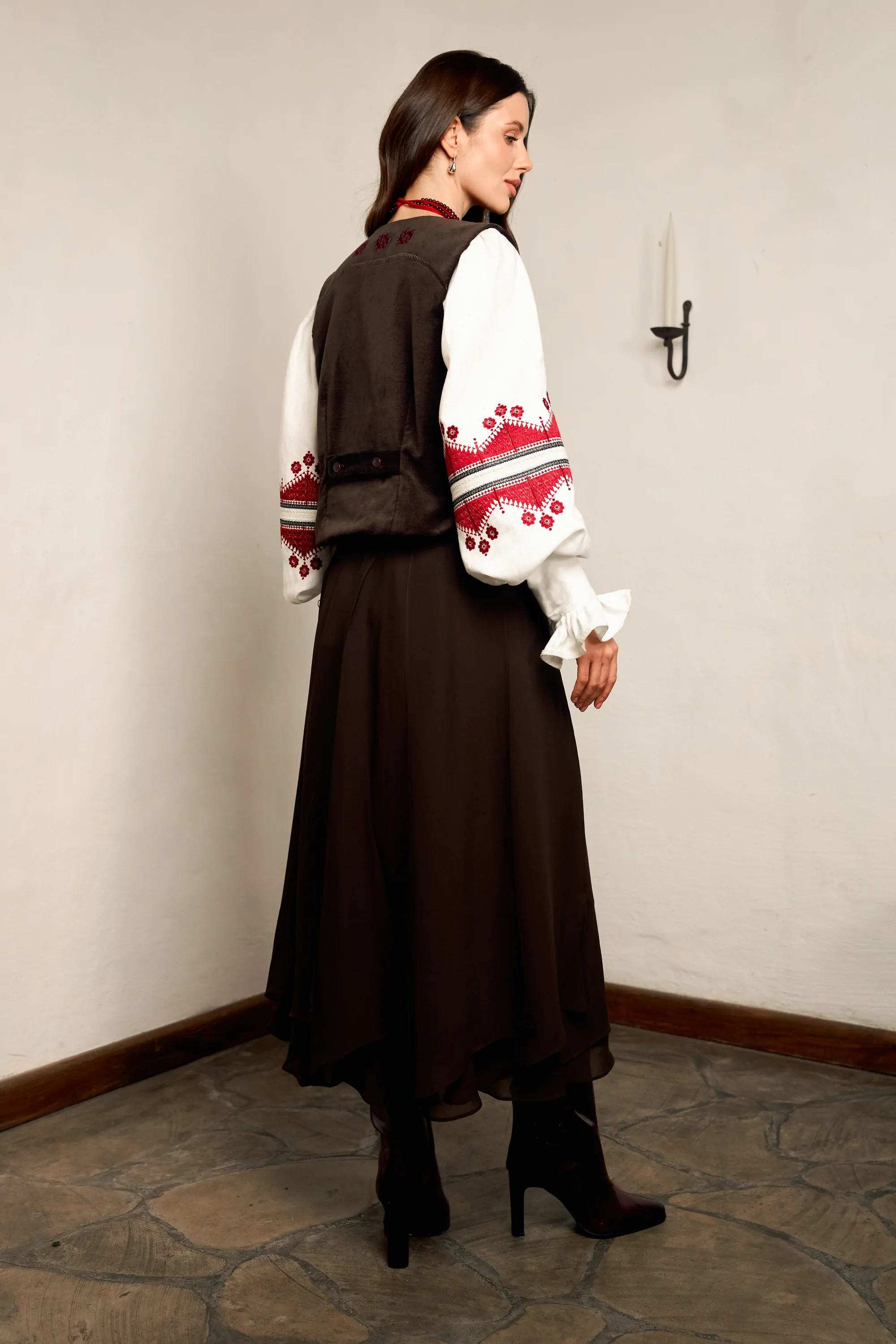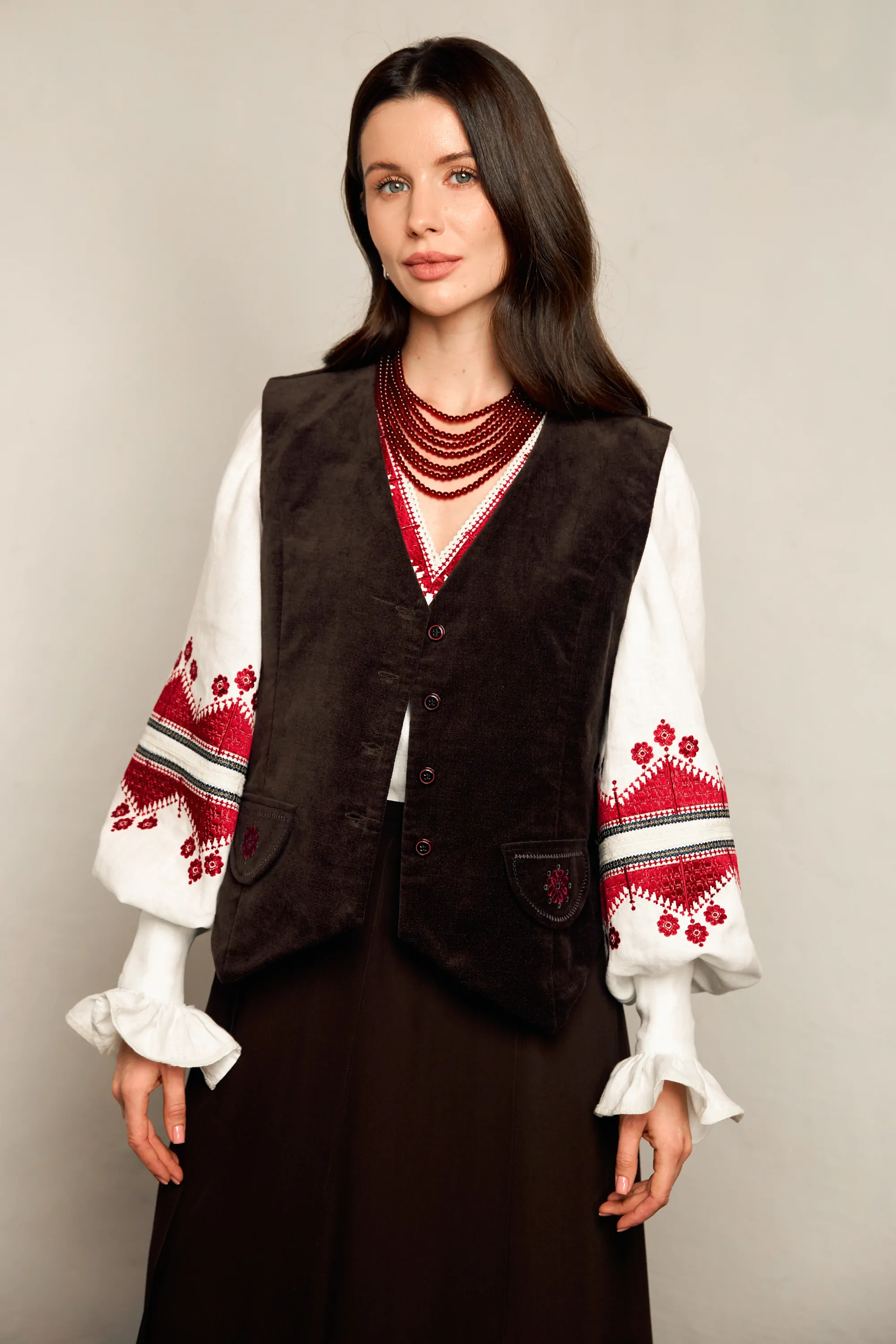 Жіноча жилетка мінімалістичного дизайну з оздобленням у вигляді зірок на декоративних кишеньках. Виконана в коричневому кольорі, застібається на ґудзики.